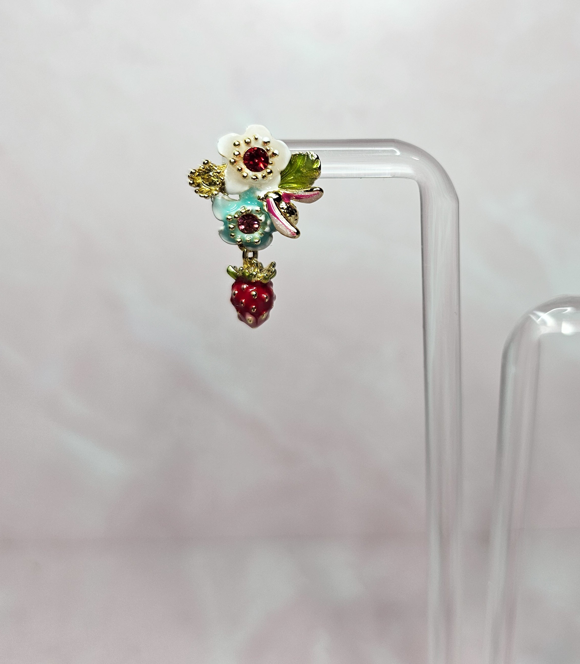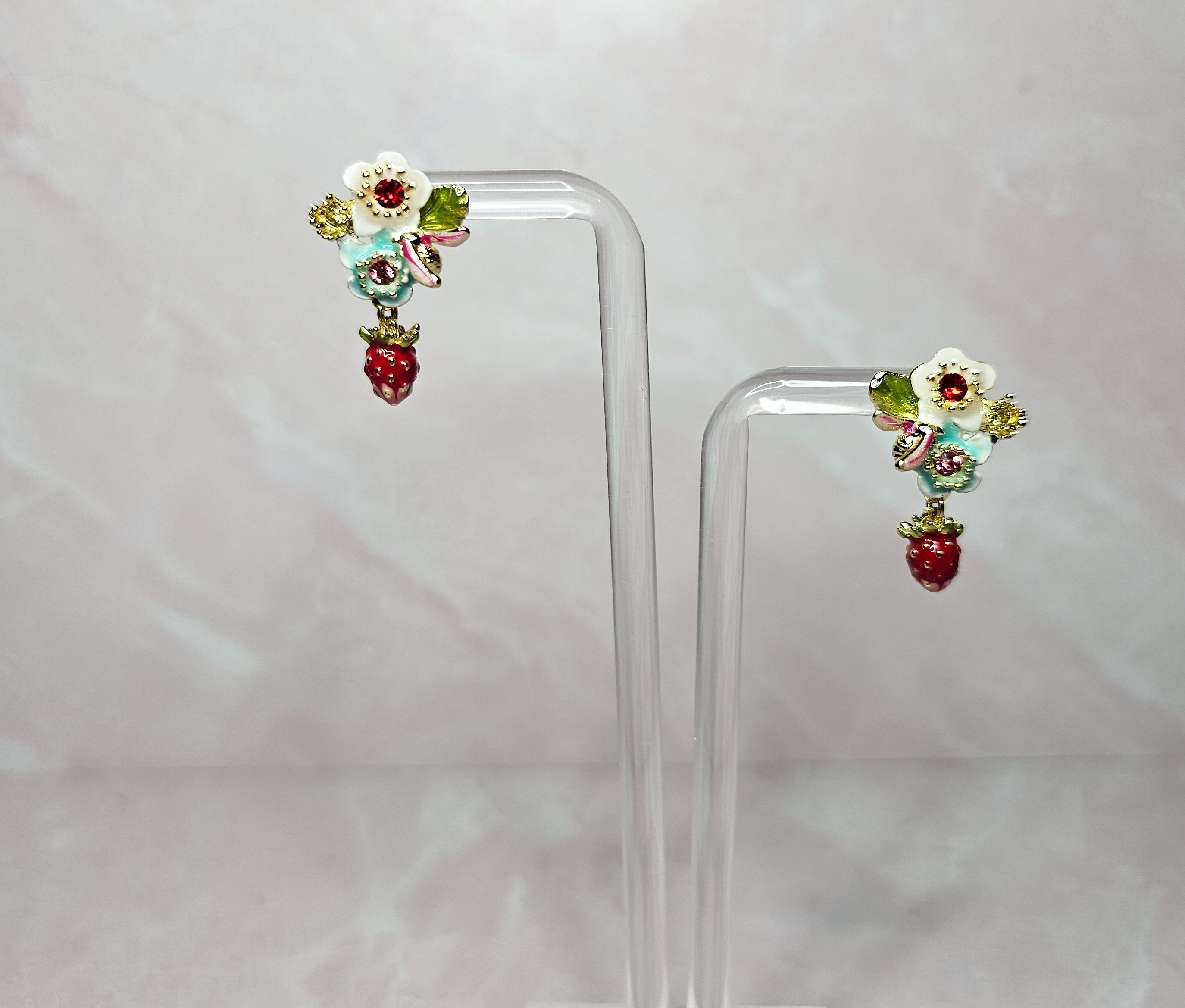 These dainty earrings feature small strawberries and flowers, creating a delicate and charming design. Made with exquisite craftsmanship, these earrings offer a unique and feminine look perfect for any occasion. Add a touch of sweetness to your outfit with these beautiful earrings.