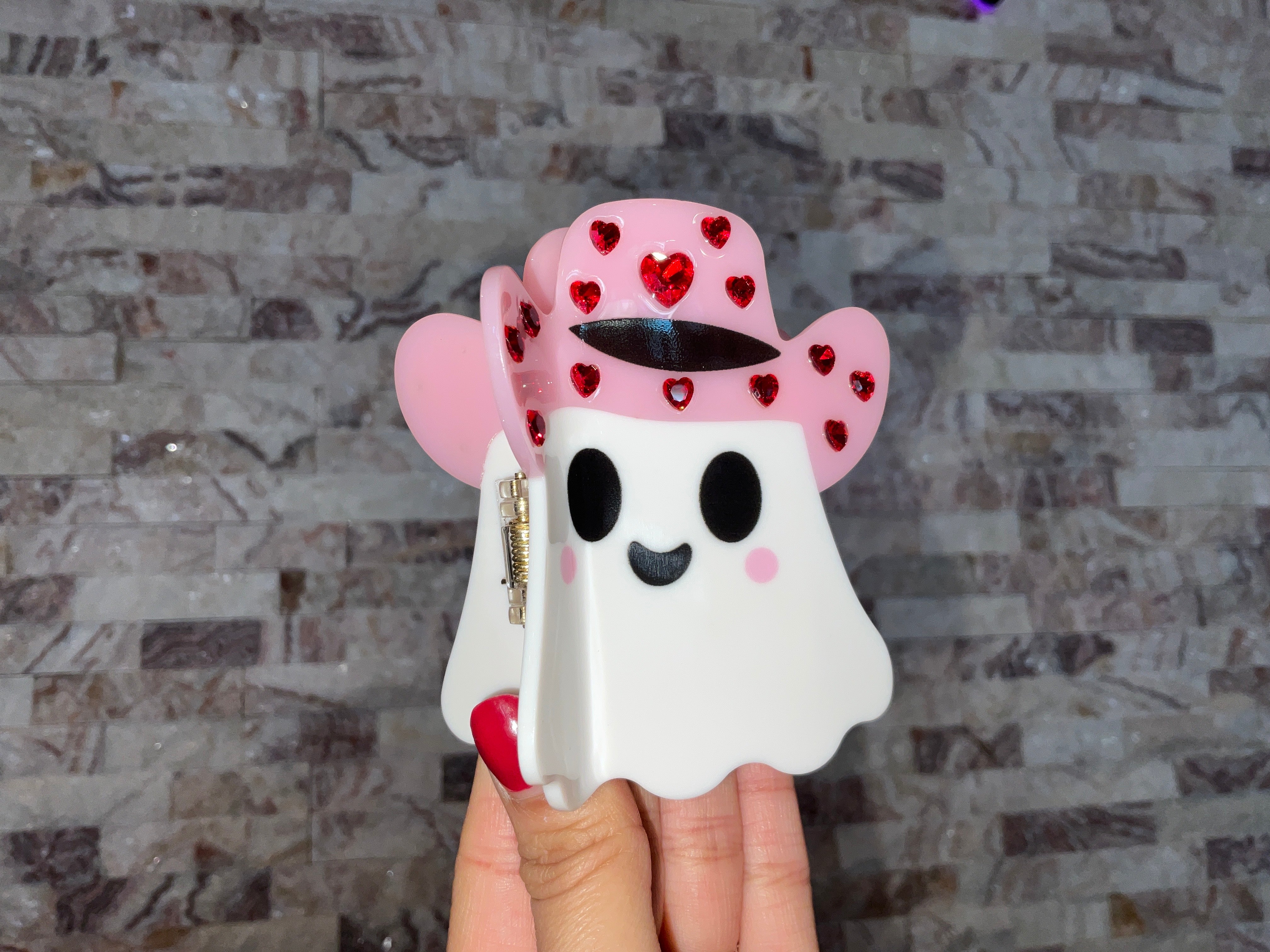 Description: Add a touch of playful spirit to your hair with the Pinky Joyful Ghost Hair Clip. This unique clip features a charming white ghost wearing a pink cowboy hat, adding a touch of fun and whimsy to any hairstyle. Made with high quality materials for long-lasting wear.