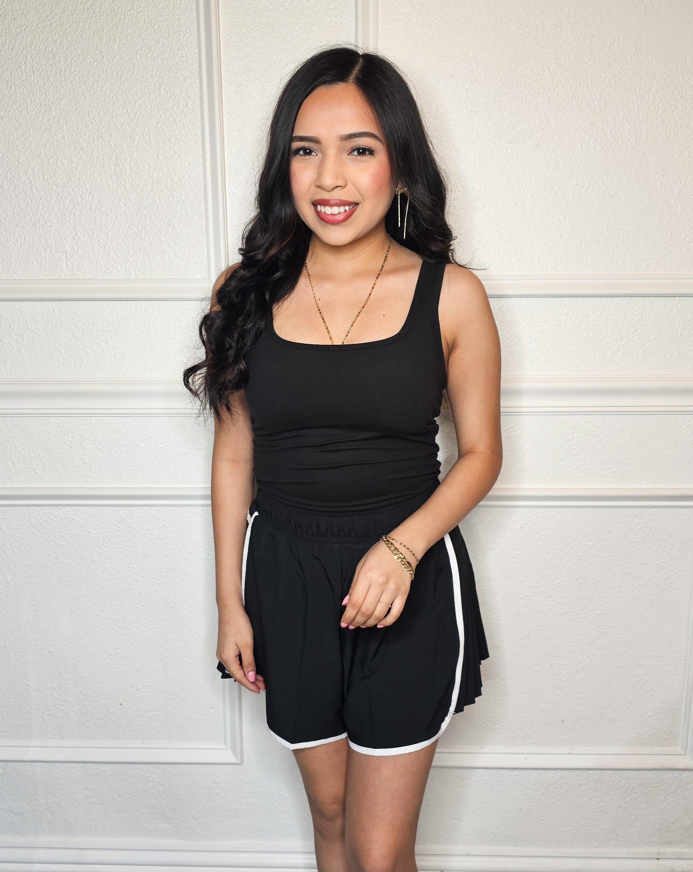 • Description: The Dreamy Romper-Black is a versatile active wear piece that offers unparalleled comfort with its butter soft fabric. This romper also features a built-in bra for added support during any physical activity. Look and feel your best while staying active with the Dreamy Romper-Black.