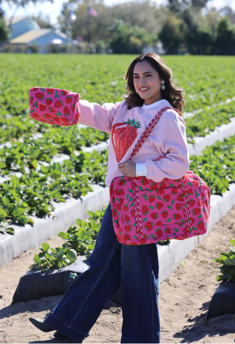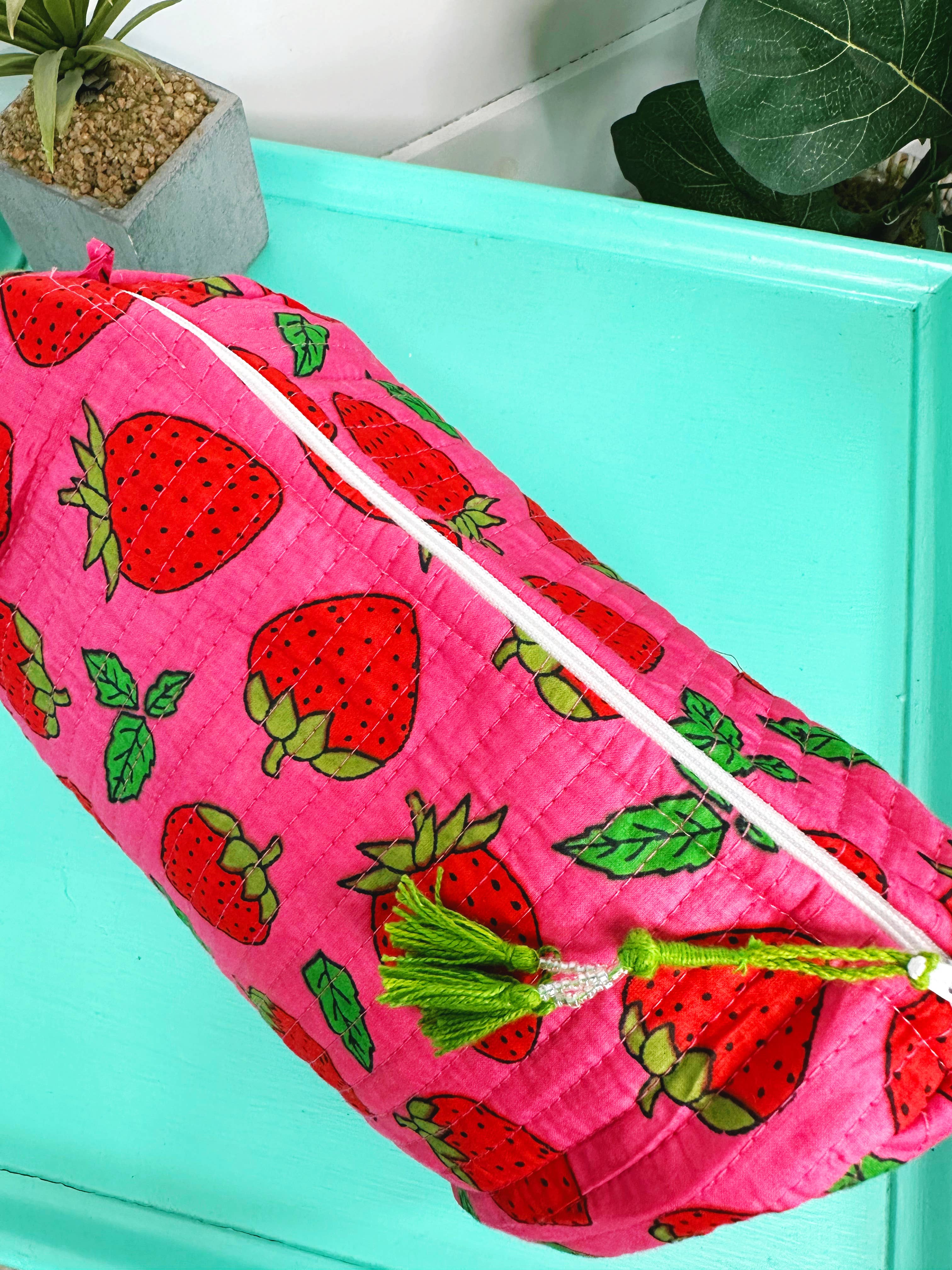 • Effortlessly travel and stay organized with our Feeling Fruity Cosmetic Bag. The pink and red strawberry print adds a touch of fun while the wipeable vinyl interior and side pockets make for easy maintenance. Handmade by Indian artisans with sustainably made cotton fabrics, this bag is both stylish and conscious.