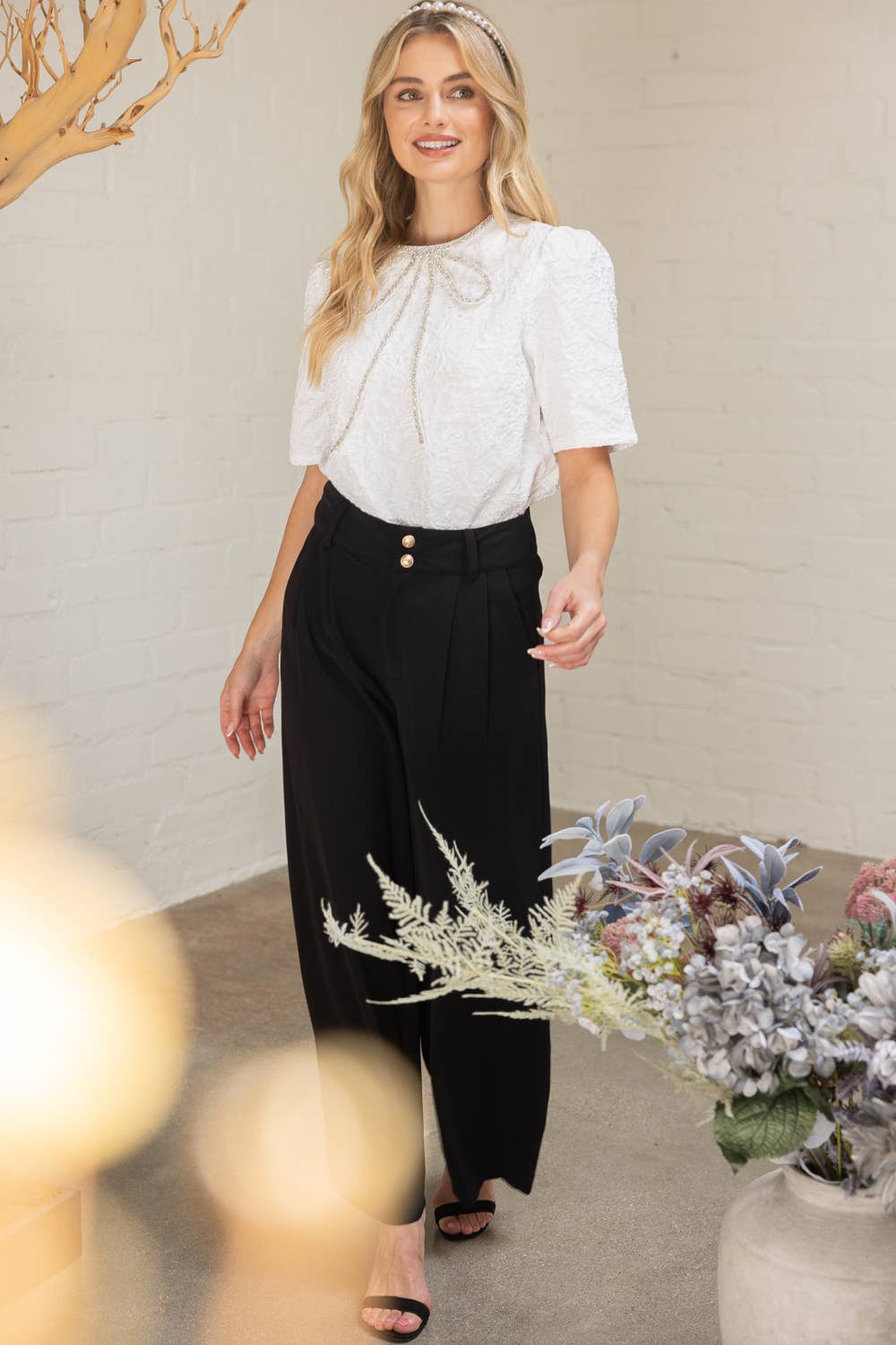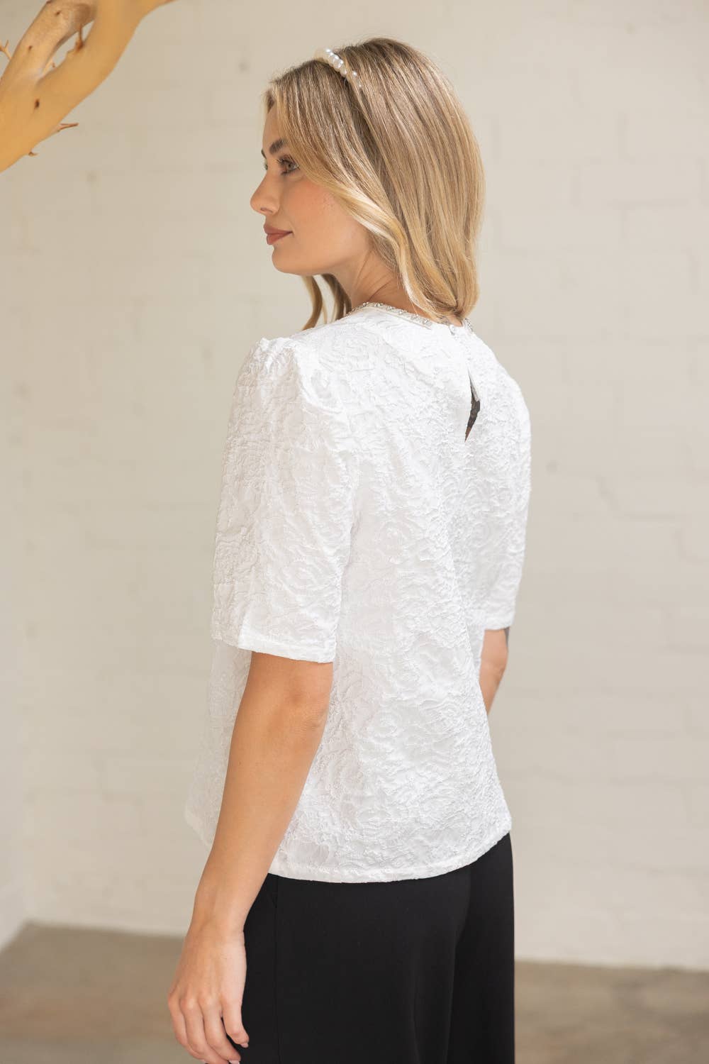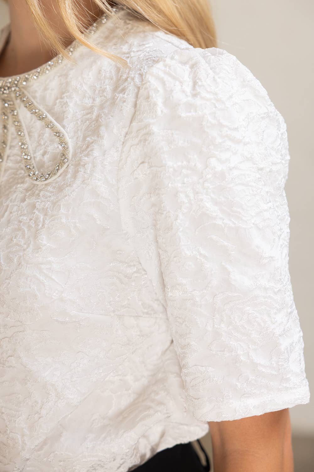 - Get a polished and elegant look with our Christine Top! Made with a floral embossed jacquard and a sparkling jeweled bow neckline, this blouse is perfect for holiday occasions or office wear. Featuring a round neckline, short sleeves, and back button closure for a classic finish. Easy to style and versatile, pair with skirts, trousers, or denim for a chic day-to-night look.