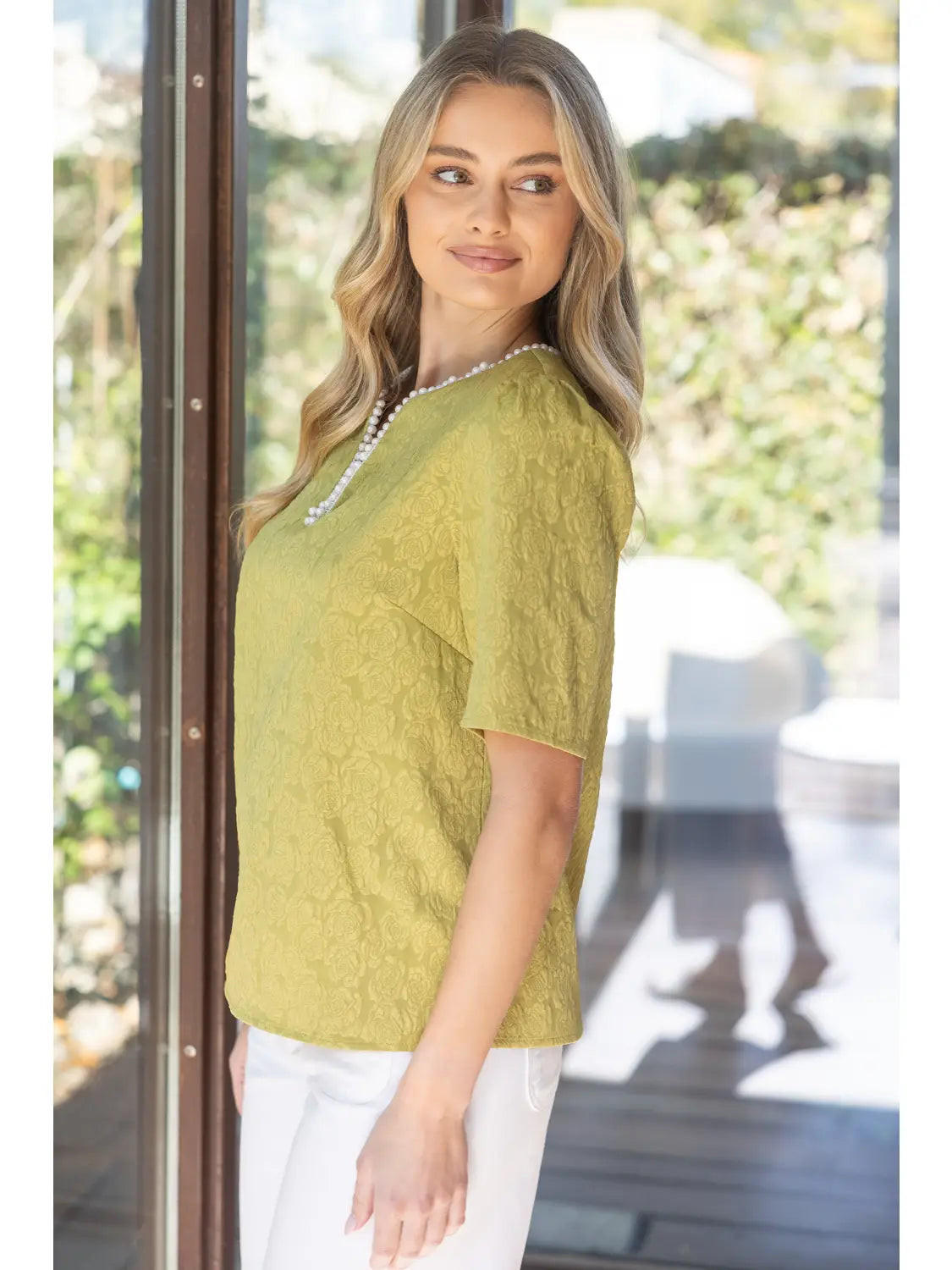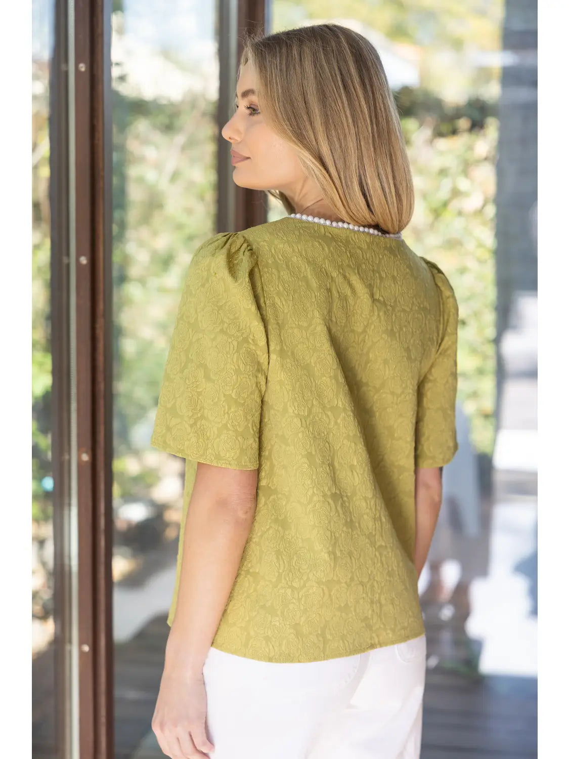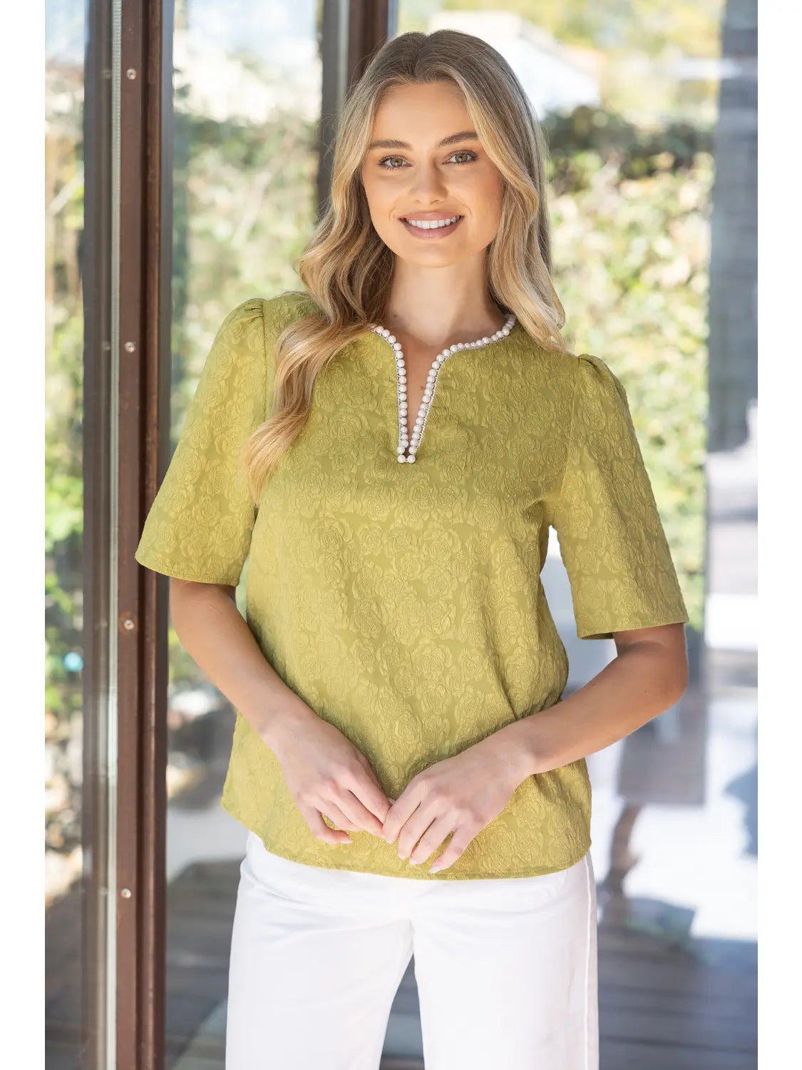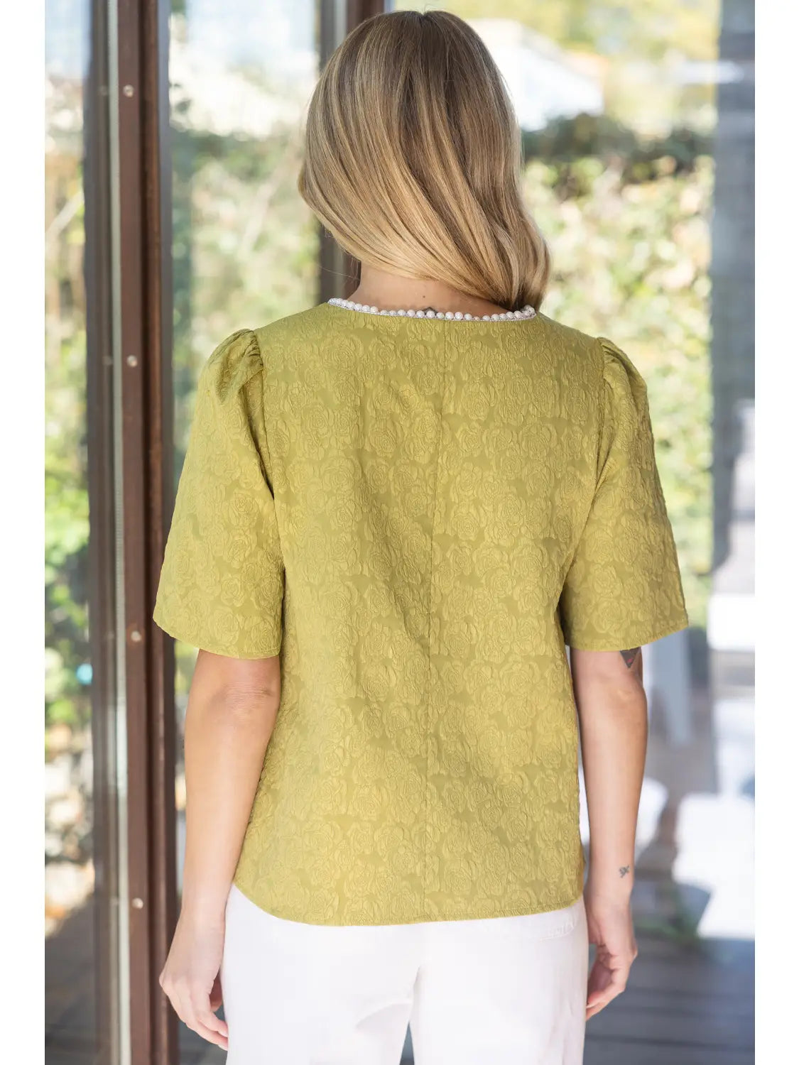 • Introducing the Amanda Top, a stylish and versatile addition to your wardrobe. Featuring a sophisticated pearl collared v-neck and a beautiful floral textured design, this top is both elegant and on-trend. Add a touch of class to any outfit with this must-have piece.