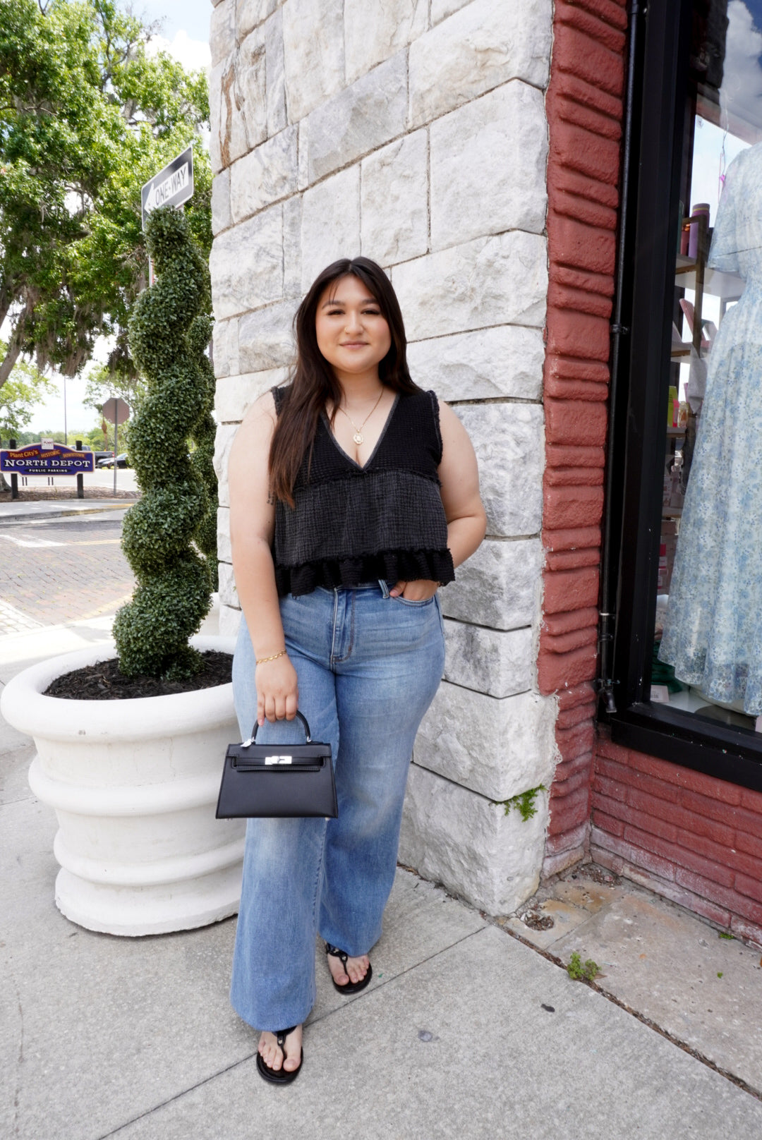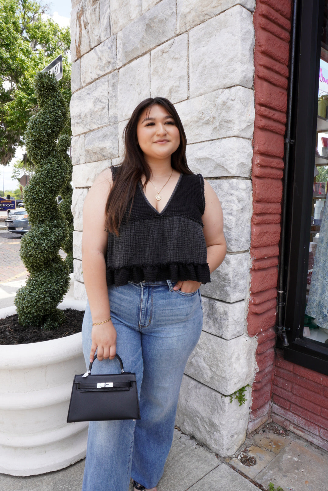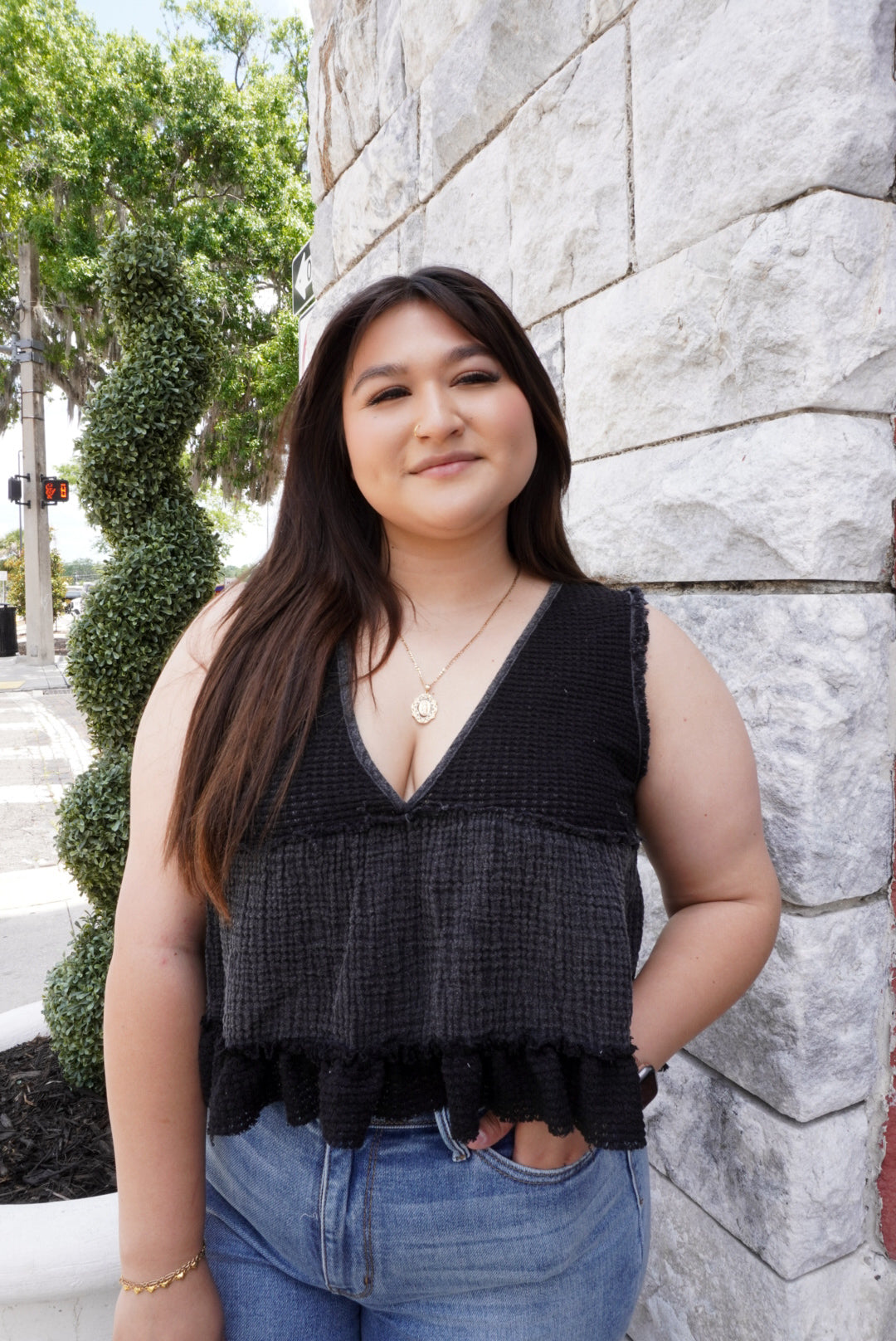 The Pure Heart Top is a black tank top with delicate knitted details and playful ruffles. This versatile top adds a touch of femininity to any outfit and is perfect for both casual and dressy occasions. Its charming design is sure to capture hearts. - Fit: True to size