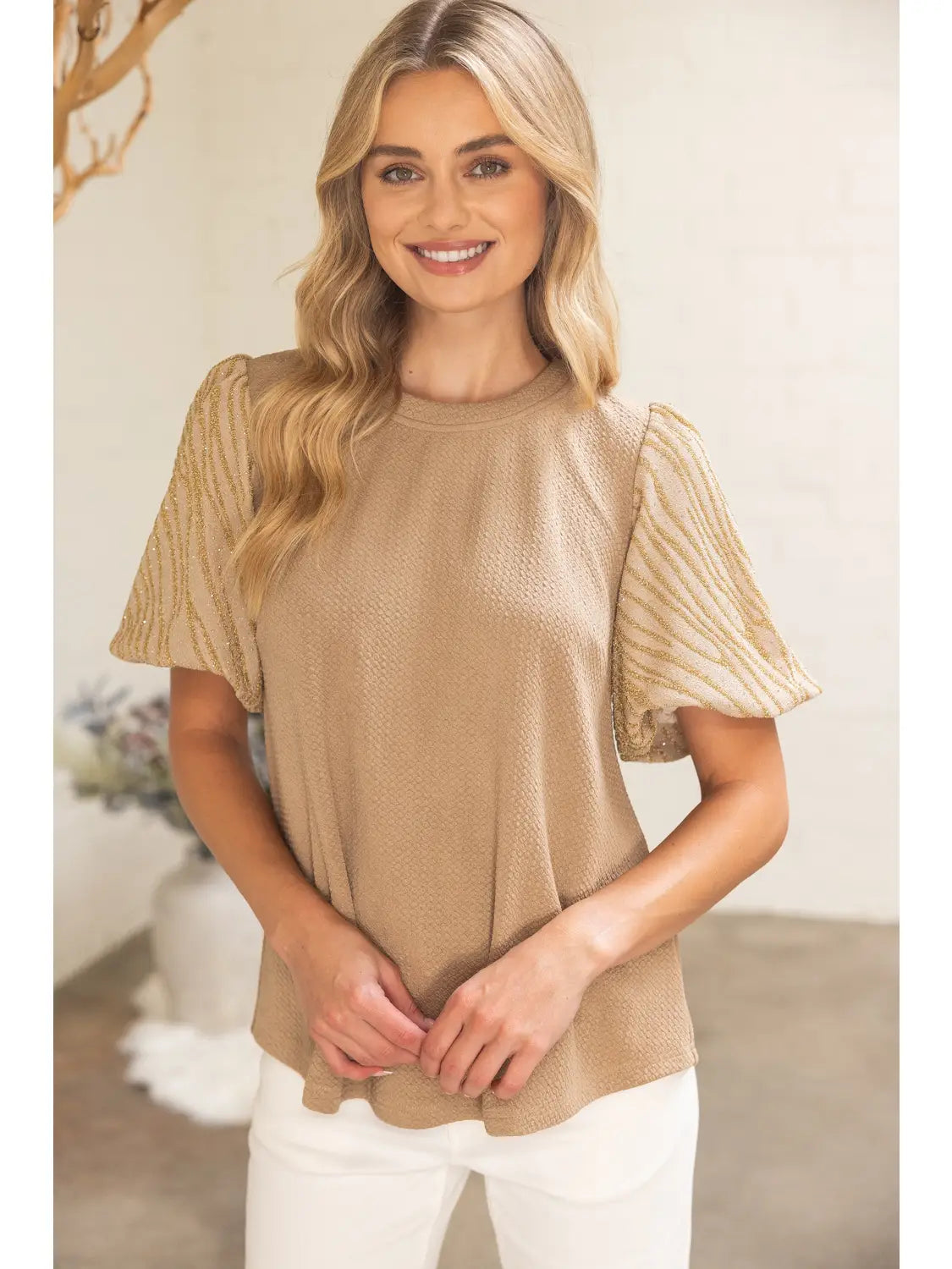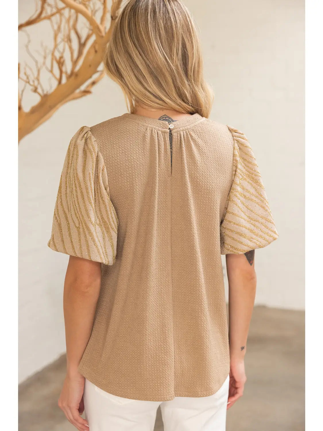 - A chic blouse featuring textured tan fabric with shimmery gold puff sleeves in a subtle glittery zebra-inspired pattern. Designed with a round neckline, half sleeves, and back button closure, it blends classic simplicity with a touch of glam.