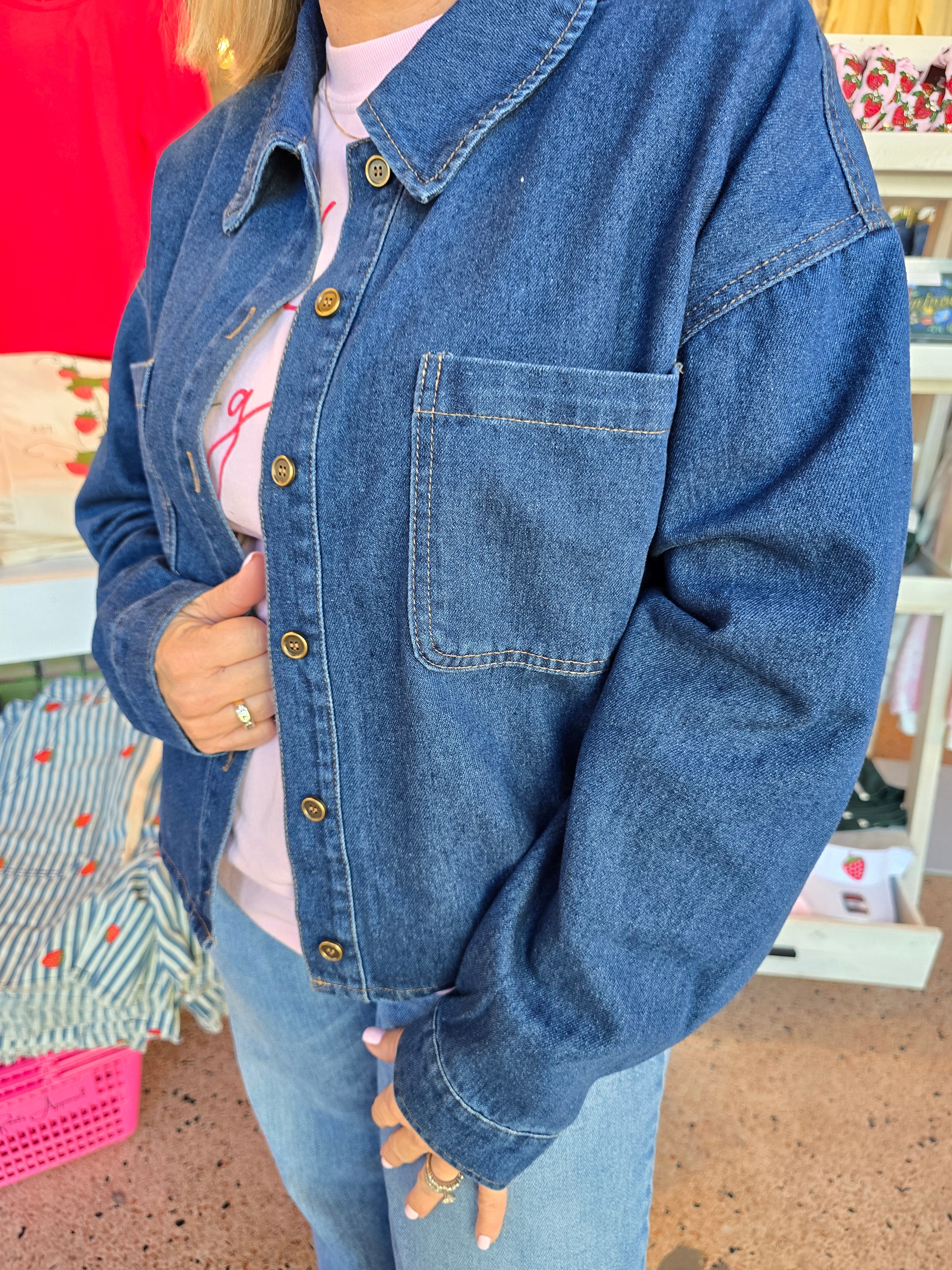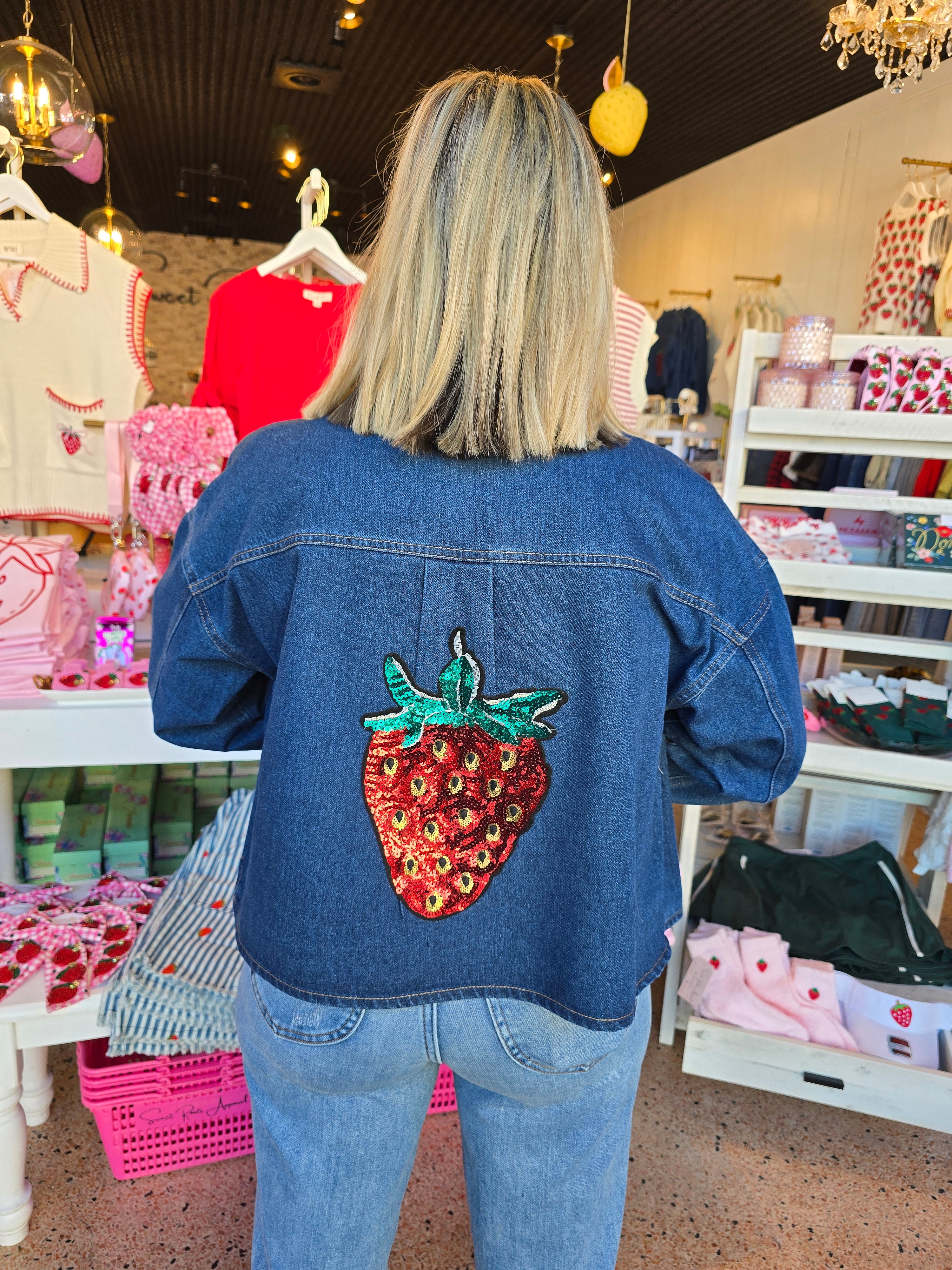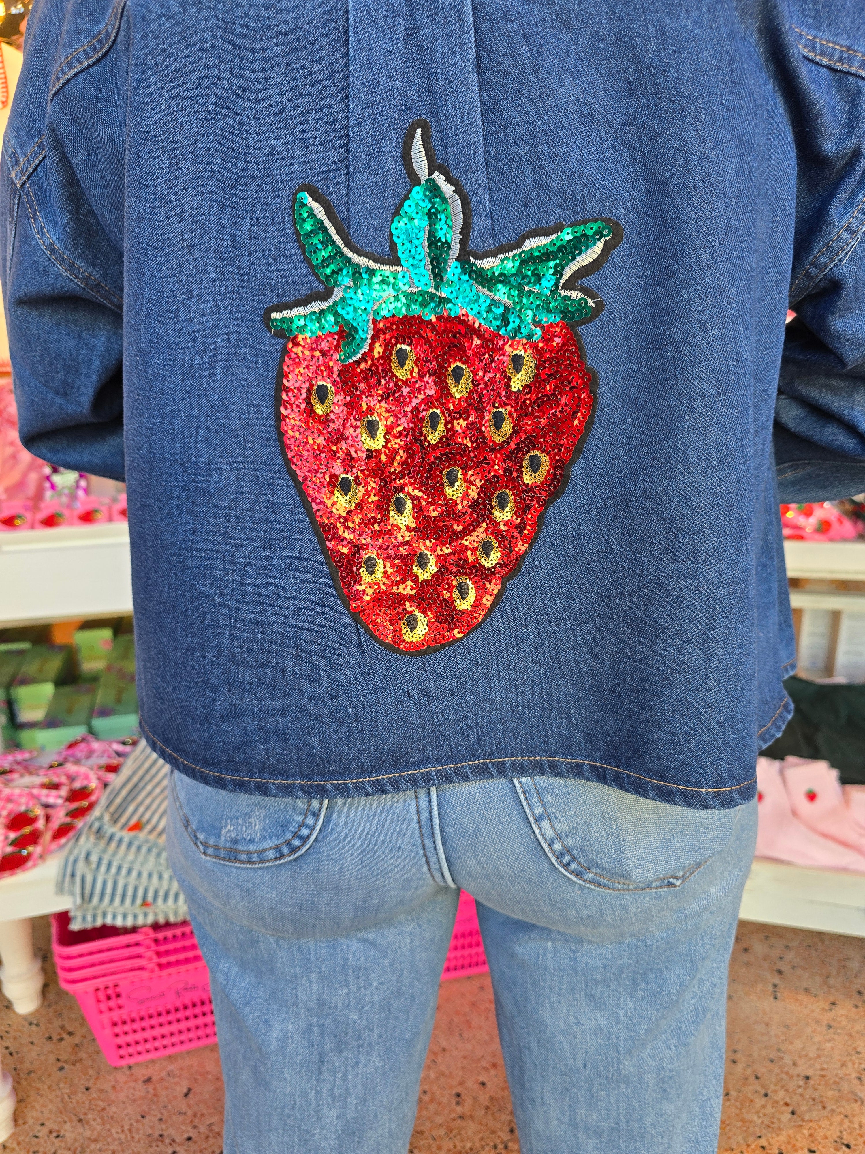 - The Amelia Denim Jacket combines a classic collared design with long sleeves and drop shoulders for a contemporary fit, and a sequin strawberry on the back adds a nice touch. Its cropped length and button-down closure provide versatility, while the pockets enhance functionality. Constructed from durable denim, this jacket offers both style and practicality for a range of occasions.