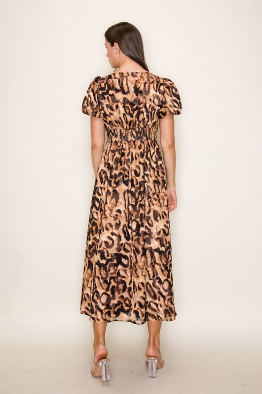 • Description: This organza animal printed v neck smocked black midi dress boasts a unique design and flattering silhouette. Made with luxurious fabric, it offers both comfort and style. The smocked waist accentuates your figure while the midi length adds a touch of sophistication. Perfect for any occasion, this dress is a must-have for your wardrobe.