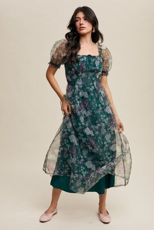 - Description: Expertly crafted in an elegant green color, this dress features a beautiful floral print that exudes grace and sophistication. Its long maxi length and short puffy sleeves offer both comfort and style, making it a versatile choice for any occasion. Elevate your wardrobe with this timeless piece.