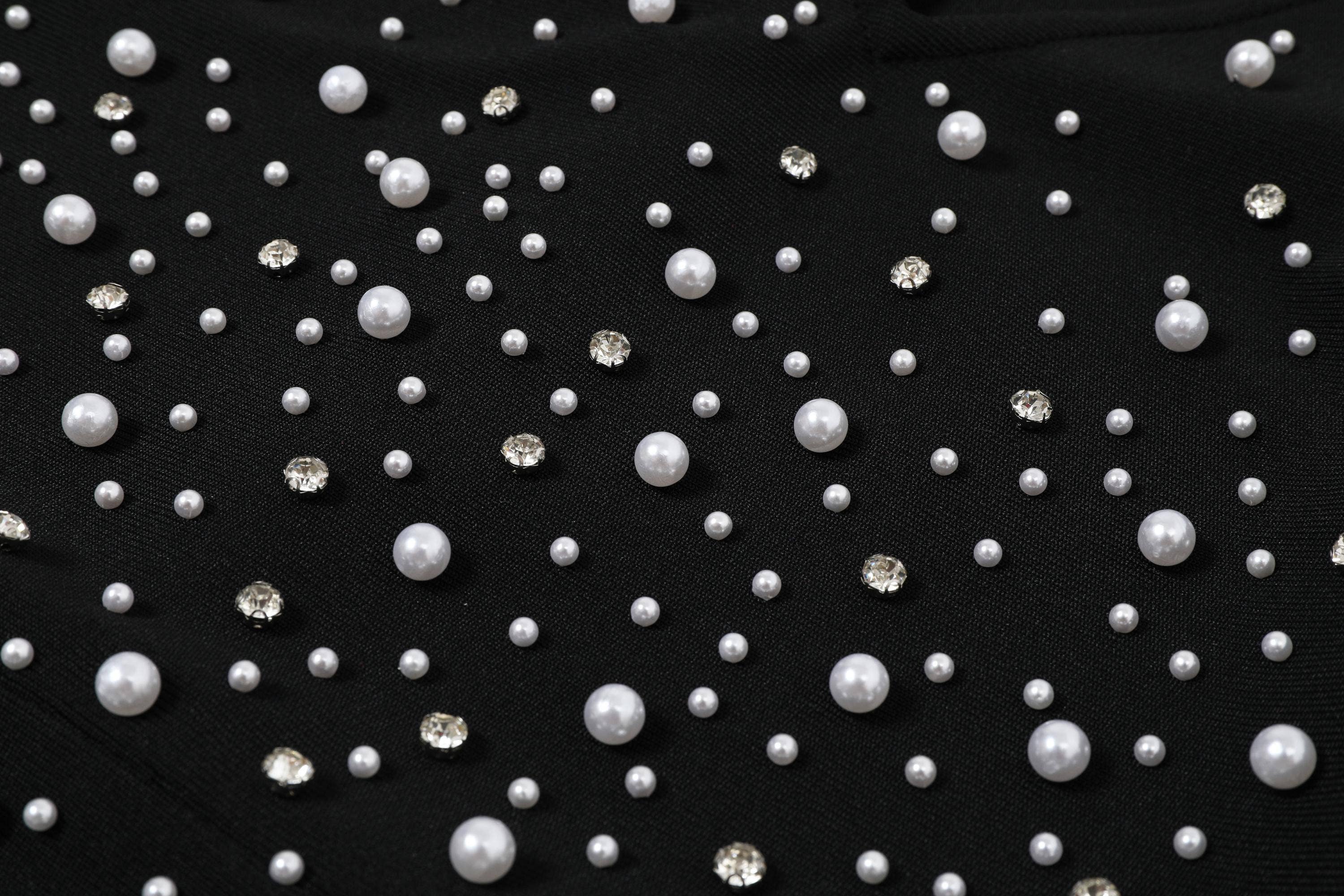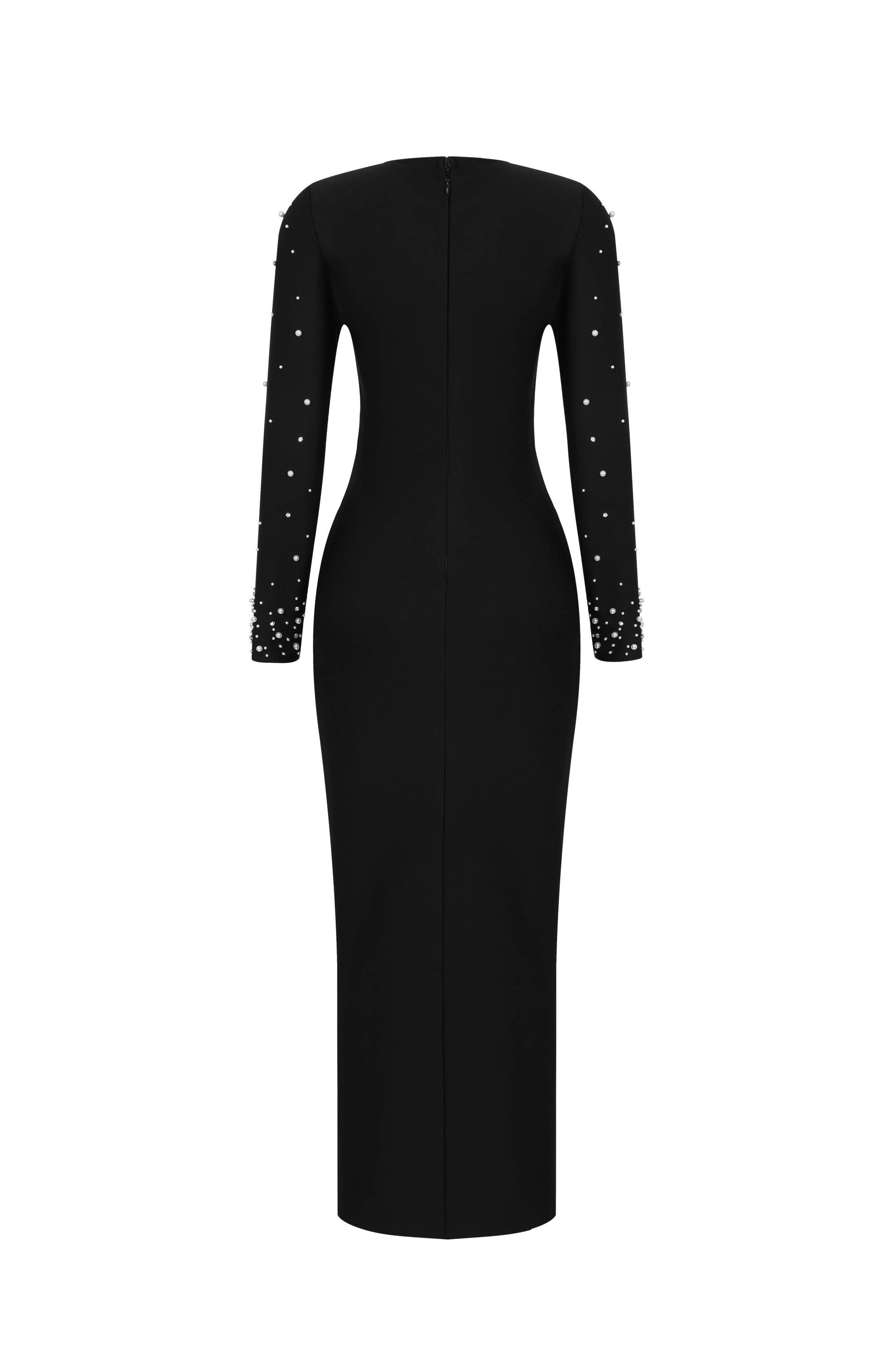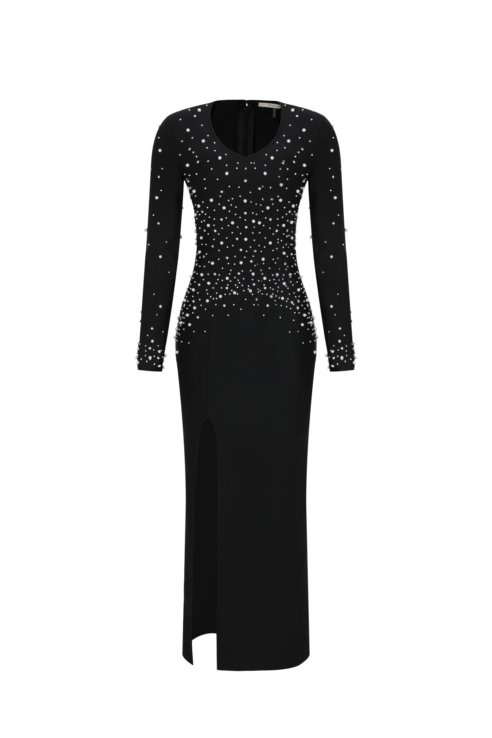 • This black maxi dress features a bandage design, a deep V-neck, and long sleeves for a modern and elegant look. With a 25 3/4 front slit and pearl embellishments, this dress is perfect for any formal occasion. The back zipper ensures a secure and comfortable fit.