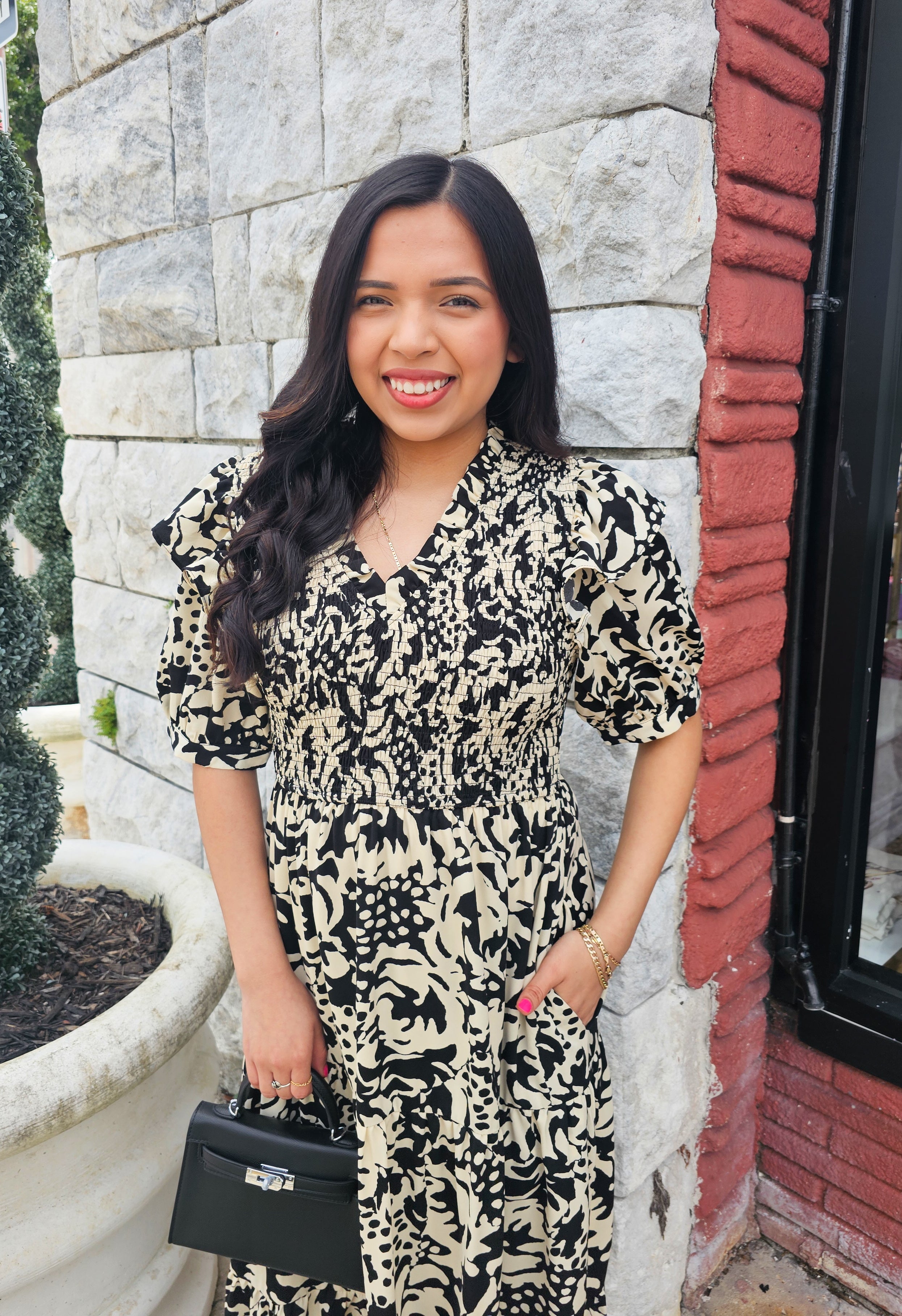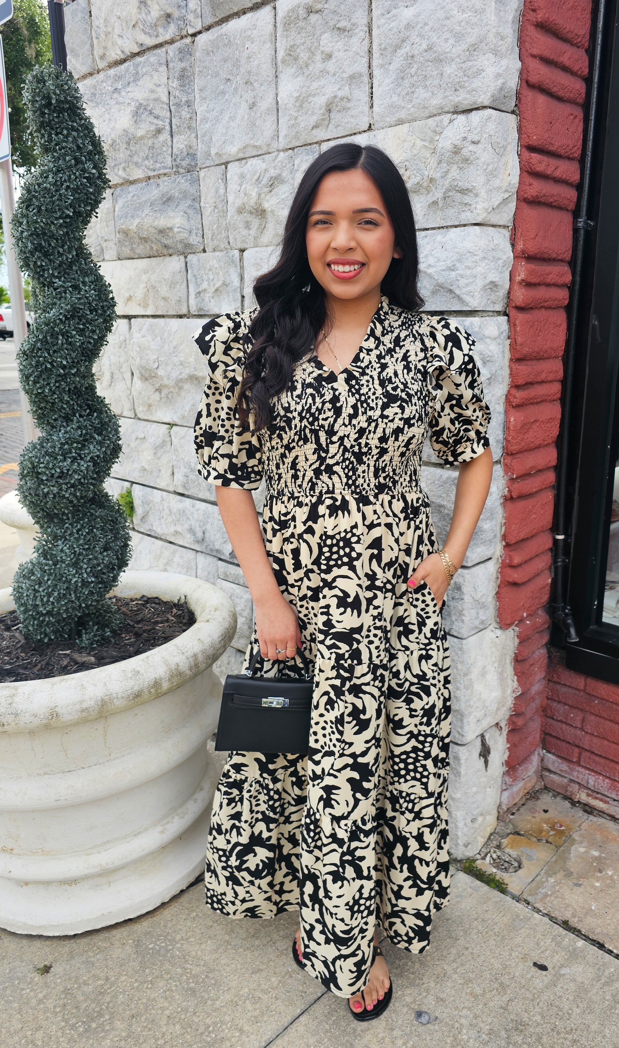 - Description:Introducing the Windflower Dress: a stylish and versatile addition to your wardrobe. This black and white maxi dress features elegant ruffle 3/4 sleeves and a ruffle V-neck, adding a touch of femininity. With the added convenience of pockets, it's perfect for any occasion.