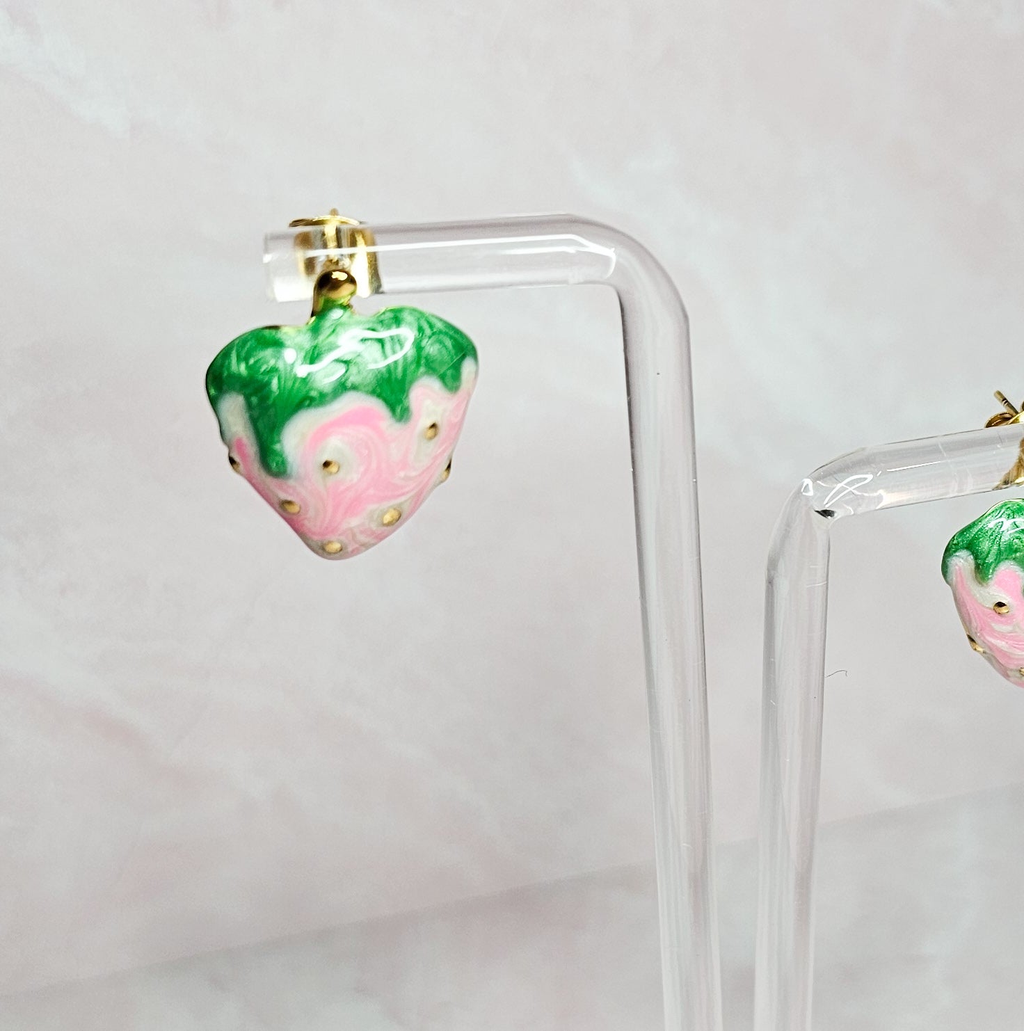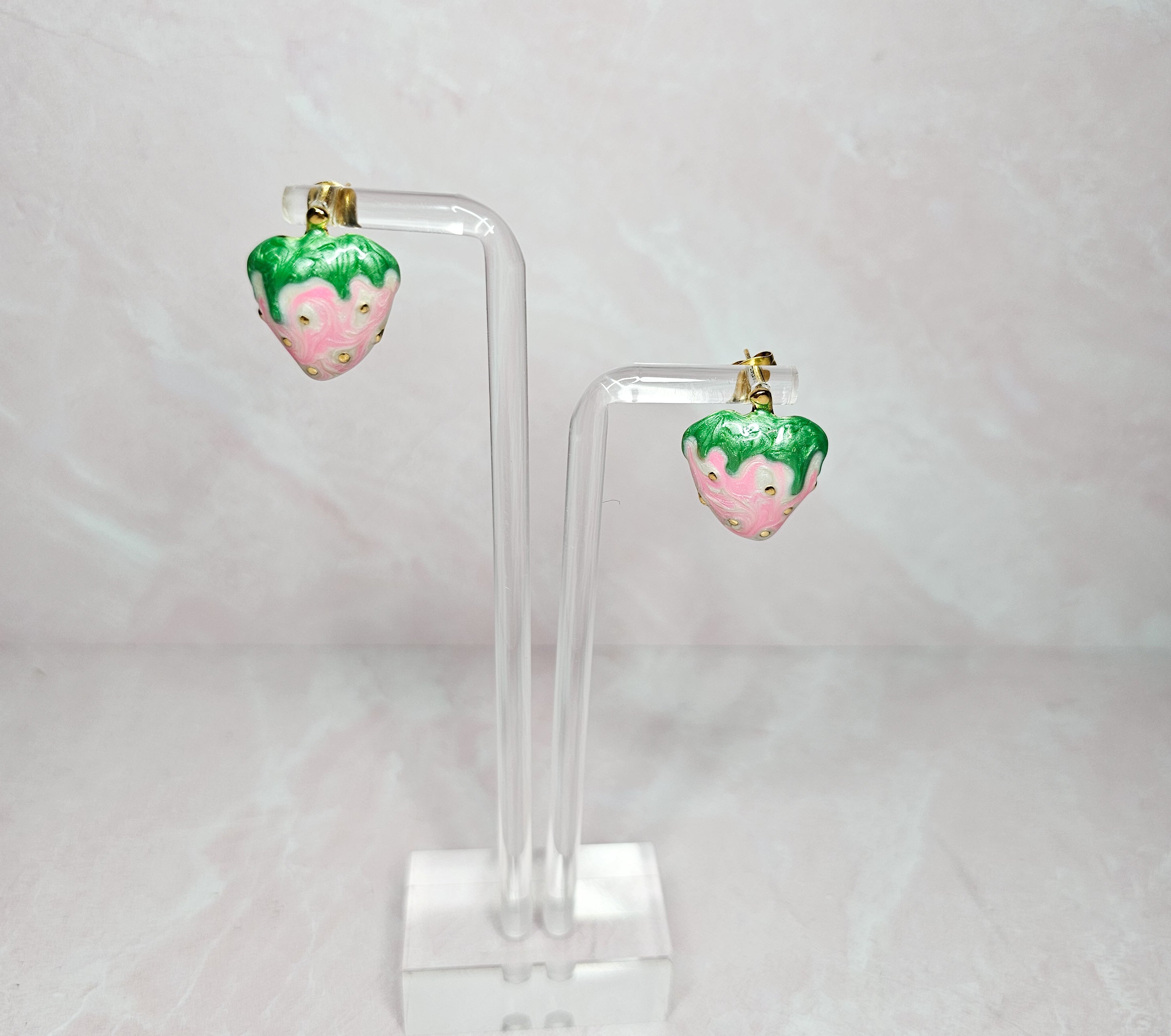 These Earrings are the perfect accessory to add a touch of elegance to any outfit. The gold accents add a touch of sophistication, while the delicate pink color exudes femininity. The strawberries add the perfect touch .These earrings are sure to become a staple in your jewelry collection.