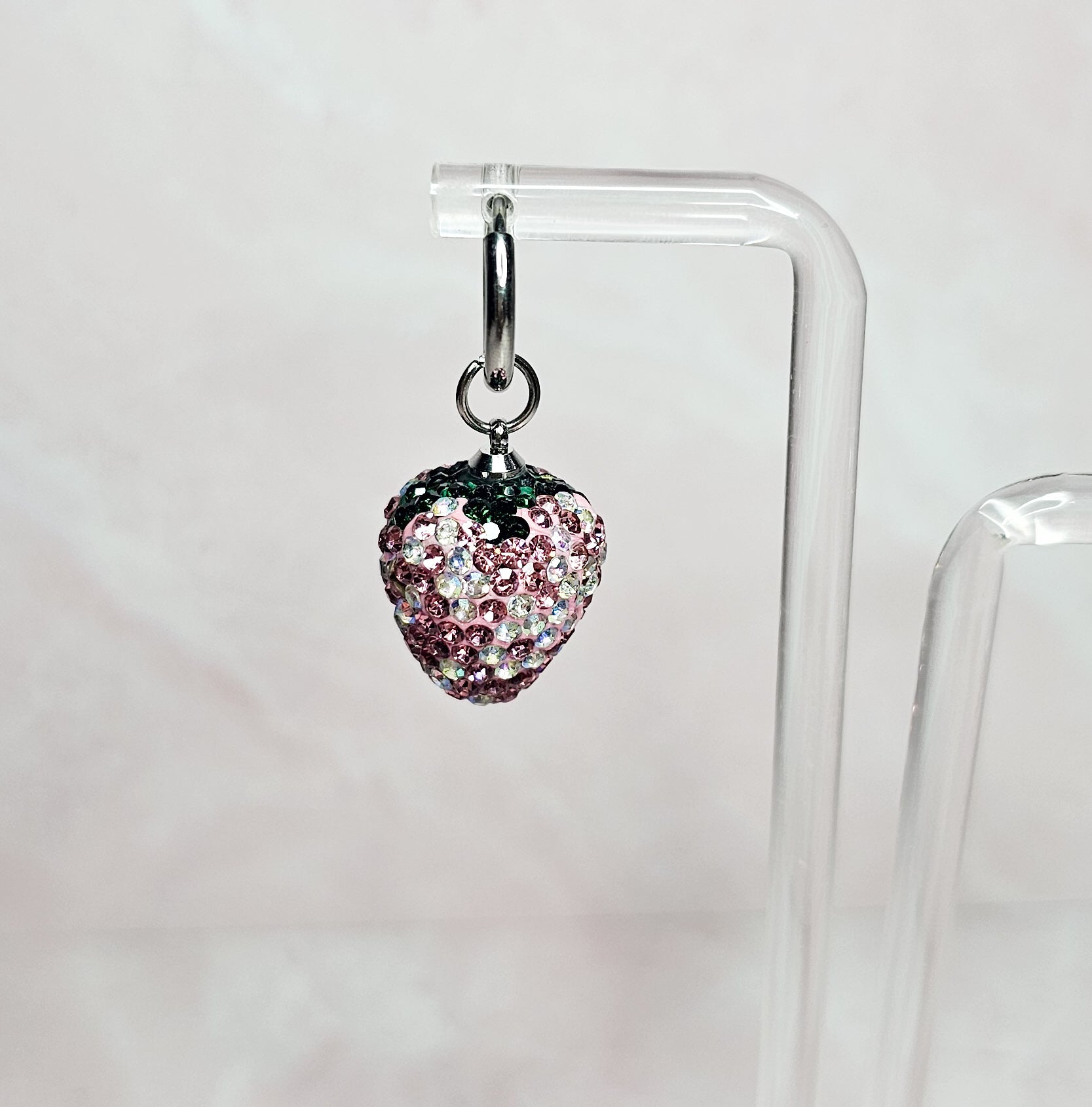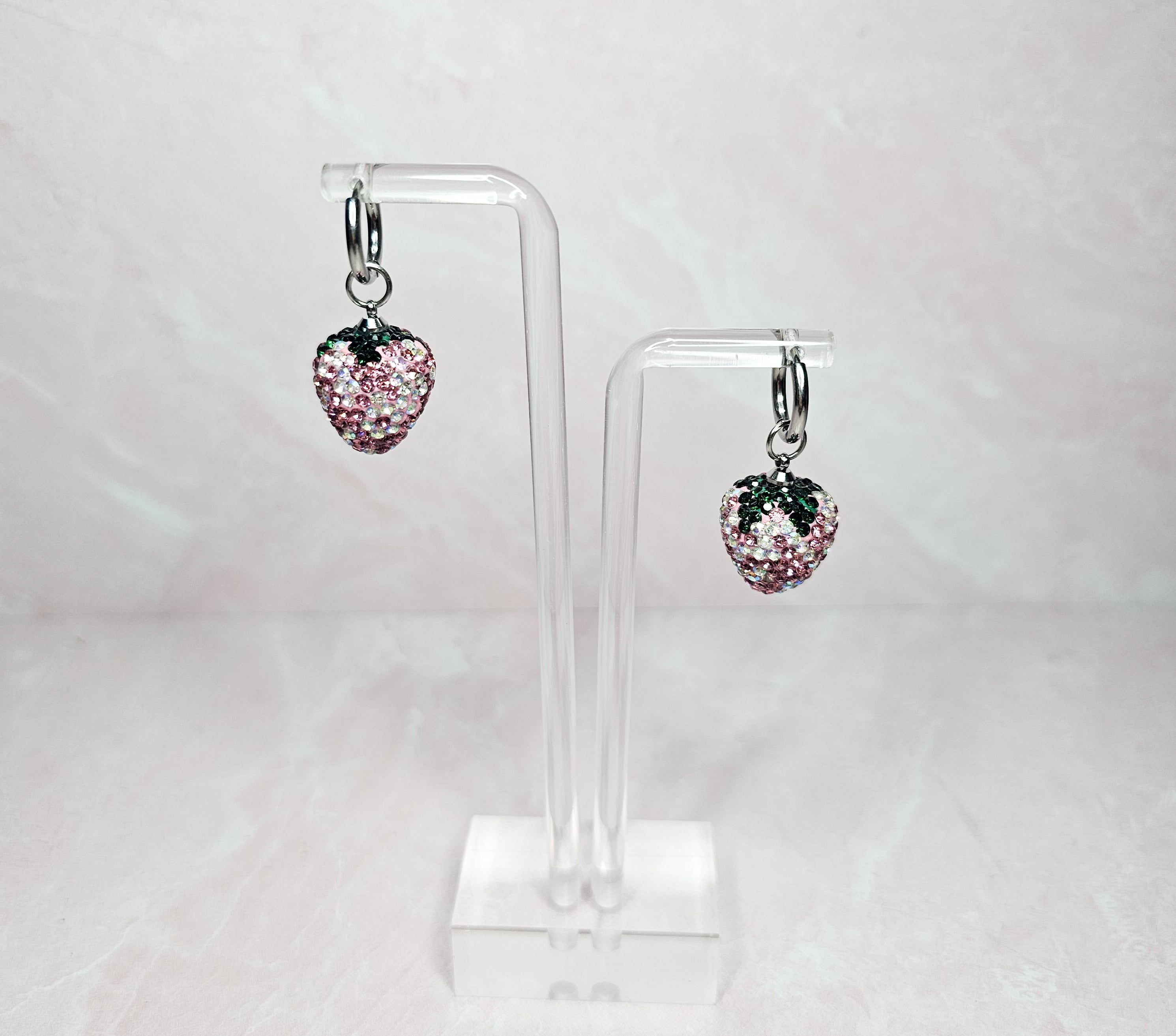 These elegant and sophisticated earrings feature a charming strawberry design and are fully adorned with sparkling rhinestones. With their eye-catching design, these earrings are the perfect accessory for any special occasion or everyday wear. Elevate your style and add a touch of glamour with these stunning earrings.