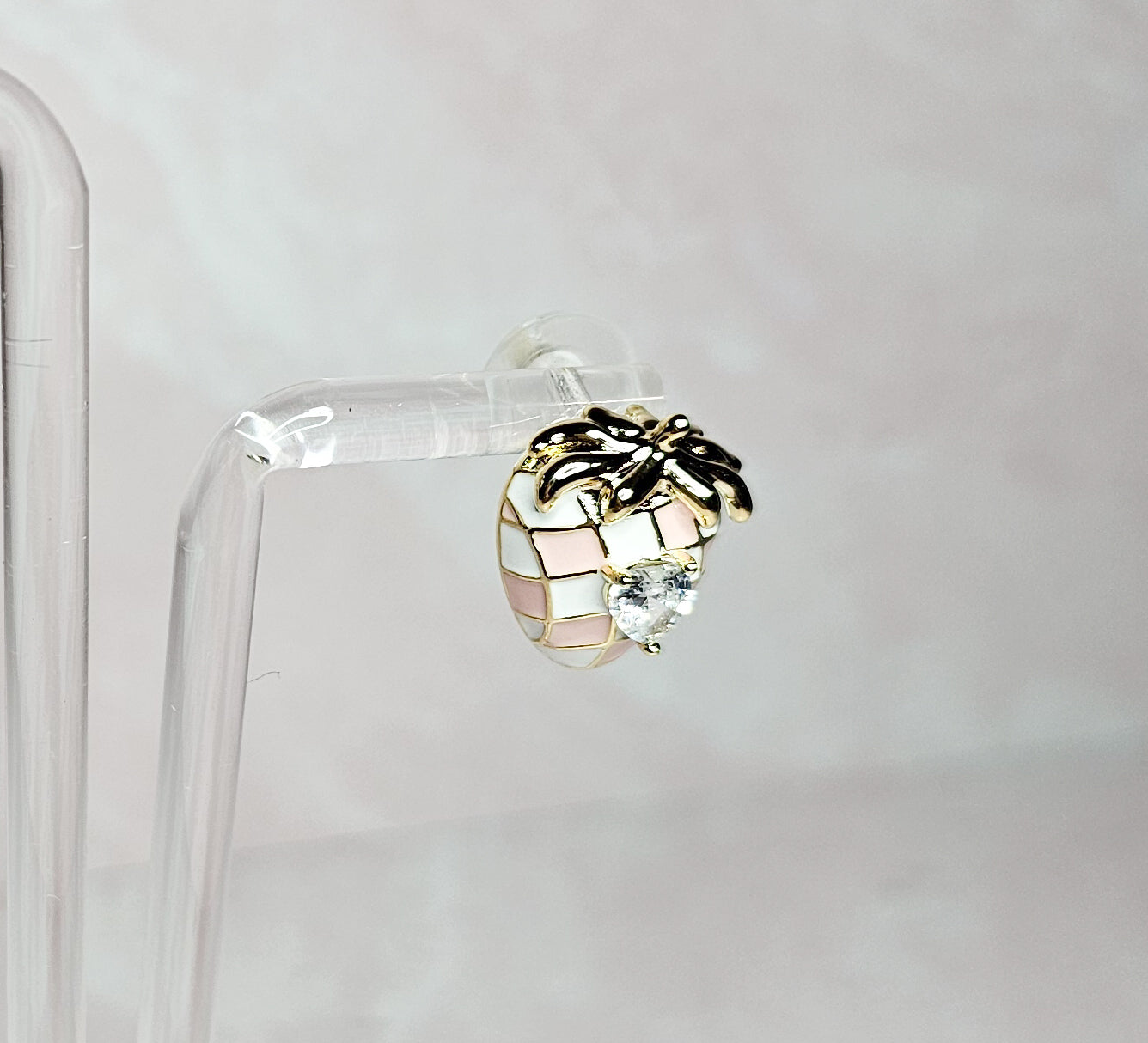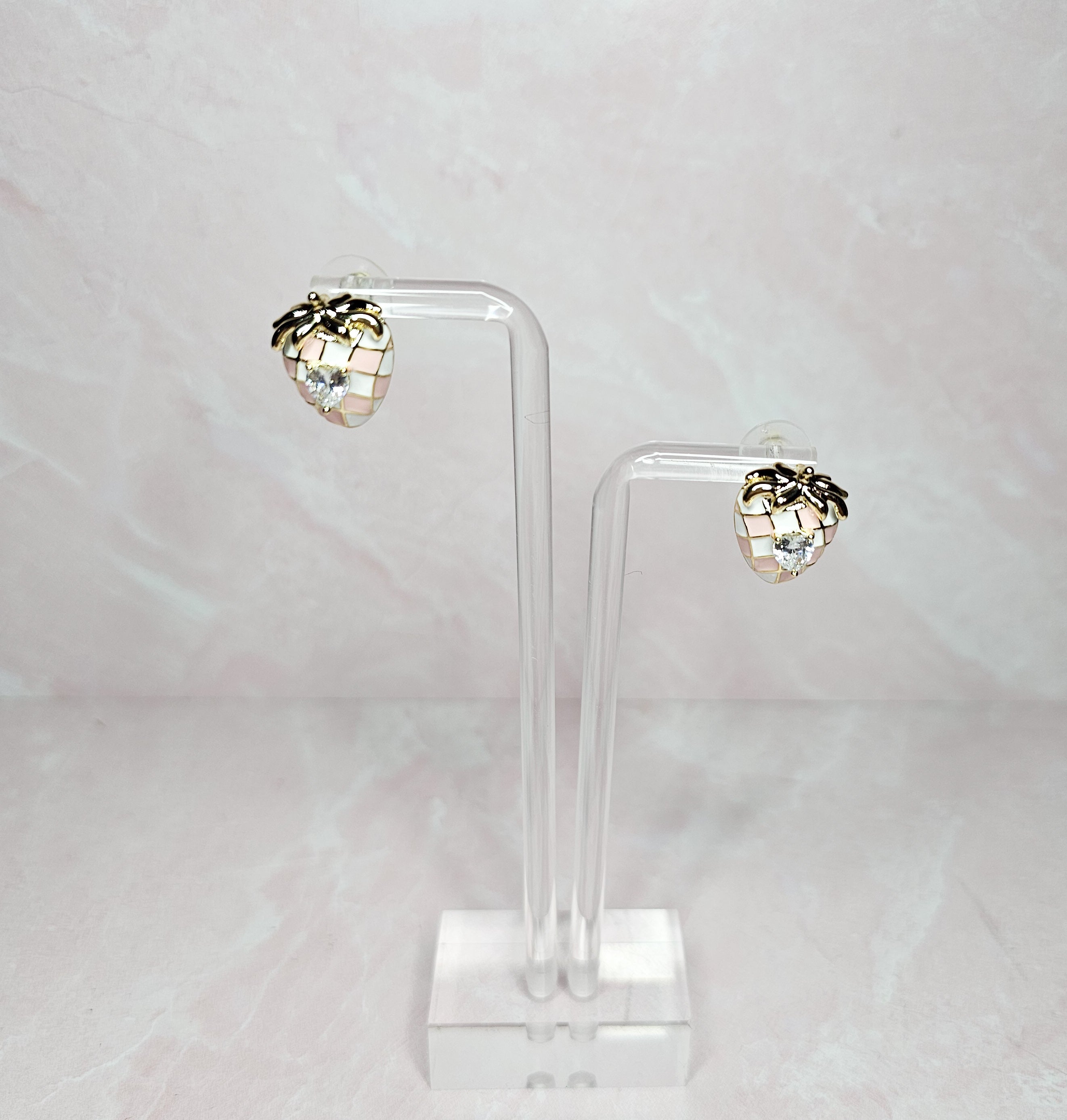 These dainty strawberry stud earrings feature sparkling rhinestones, adding a touch of elegance to any outfit. Made with small, delicate details, these earrings are the perfect accessory for any occasion. Add a sweet and stylish touch to your everyday look with these strawberry studs.