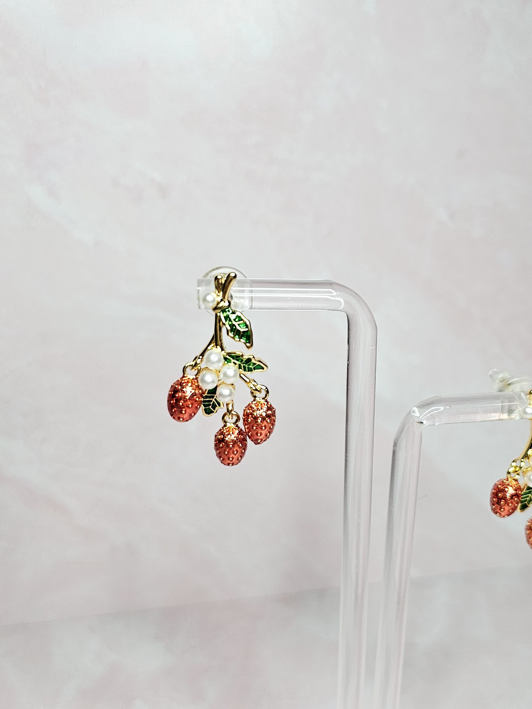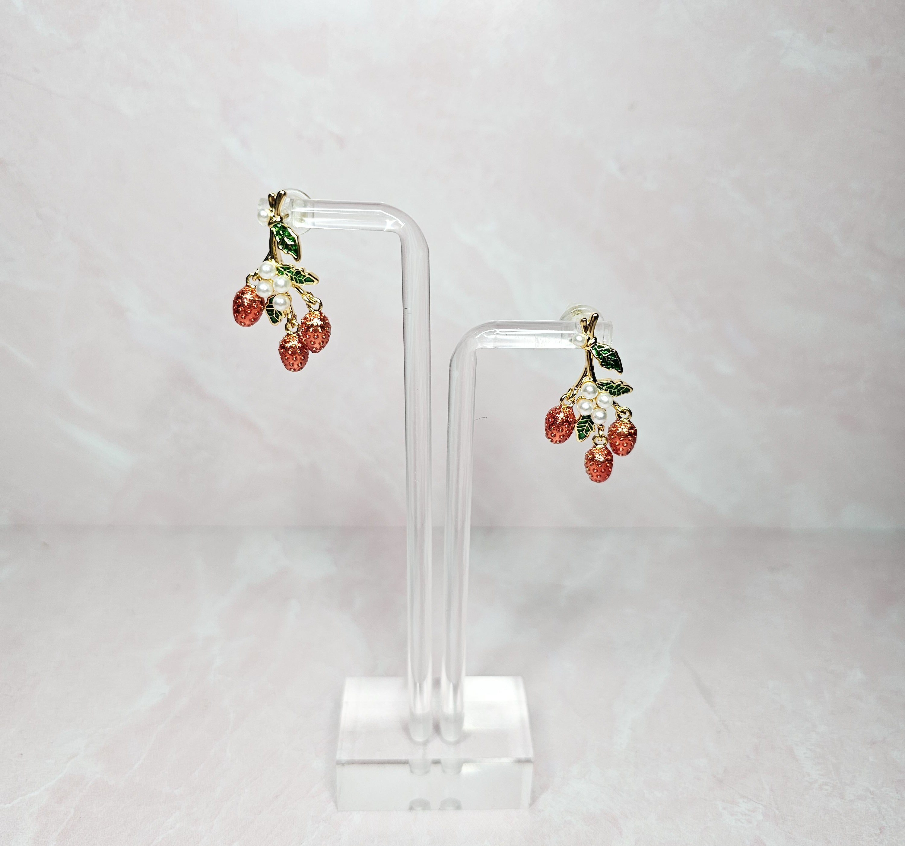 These earrings feature delicate strawberries on a stem with elegant pearl details. Hand-crafted with care, these earrings add a touch of natural beauty and sophistication to any outfit. Enjoy these unique and charming earrings, perfect for any occasion.