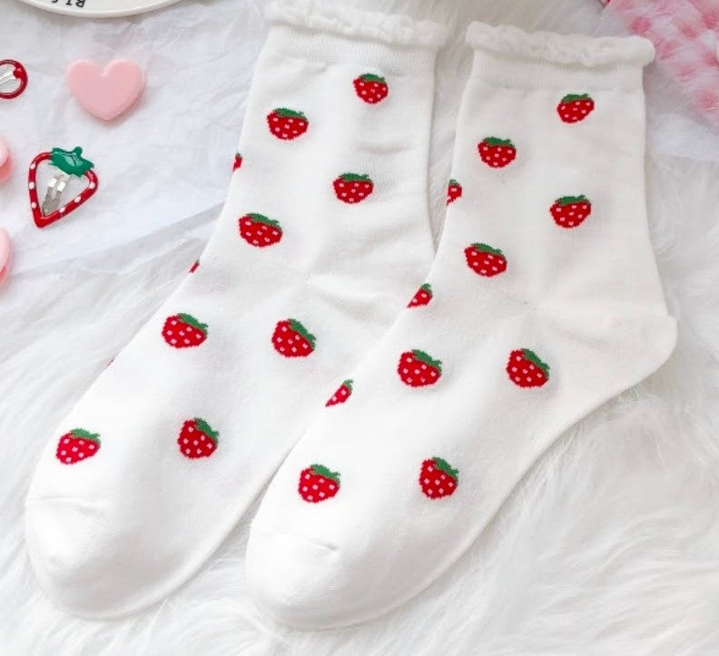 Description: The Strawberry Amber Socks feature a unique strawberry pattern across a white base, offering both style and comfort. Made from breathable materials, these socks ensure optimal moisture management and durability, making them suitable for daily wear. Their design caters to those seeking a blend of fashion and functionality in their sock collection.