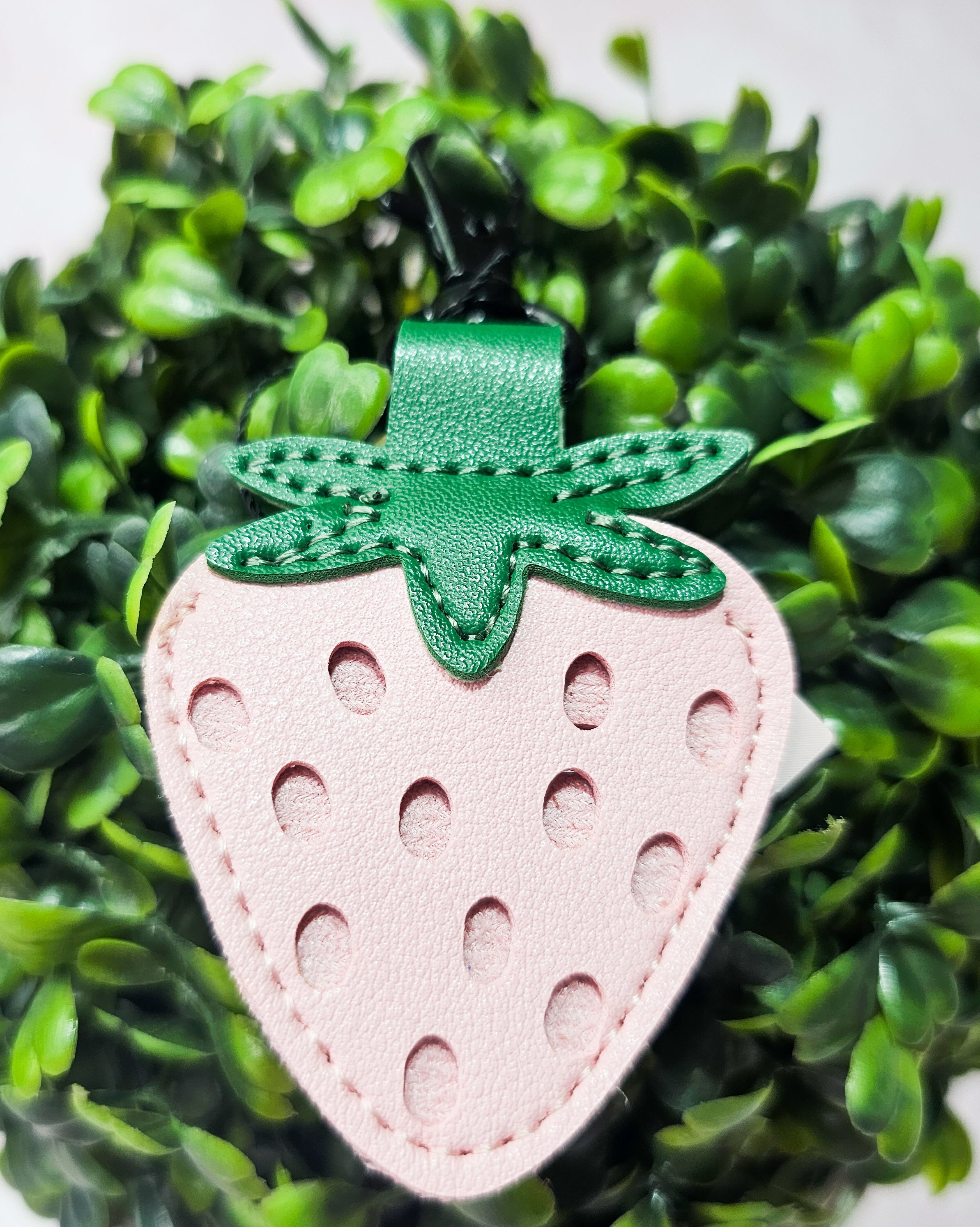 Description: This strawberry keychain, featuring vibrant red and pink colors, serves as a practical accessory for festival-goers. Its lightweight design ensures portability, while the visually appealing aesthetics enhance personal style. The keychain is an effective way to organize keys, contributing to a more efficient festival experience.