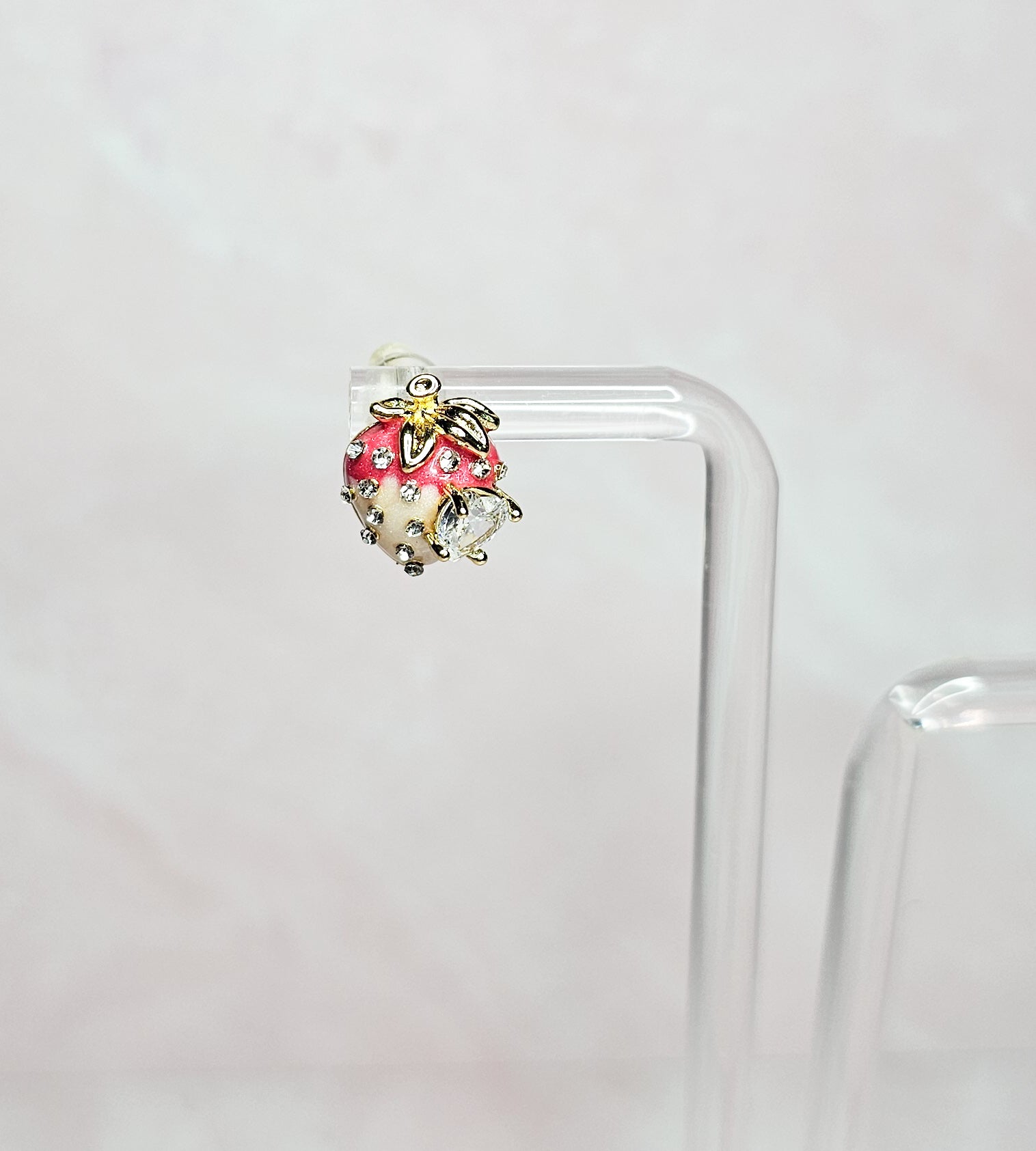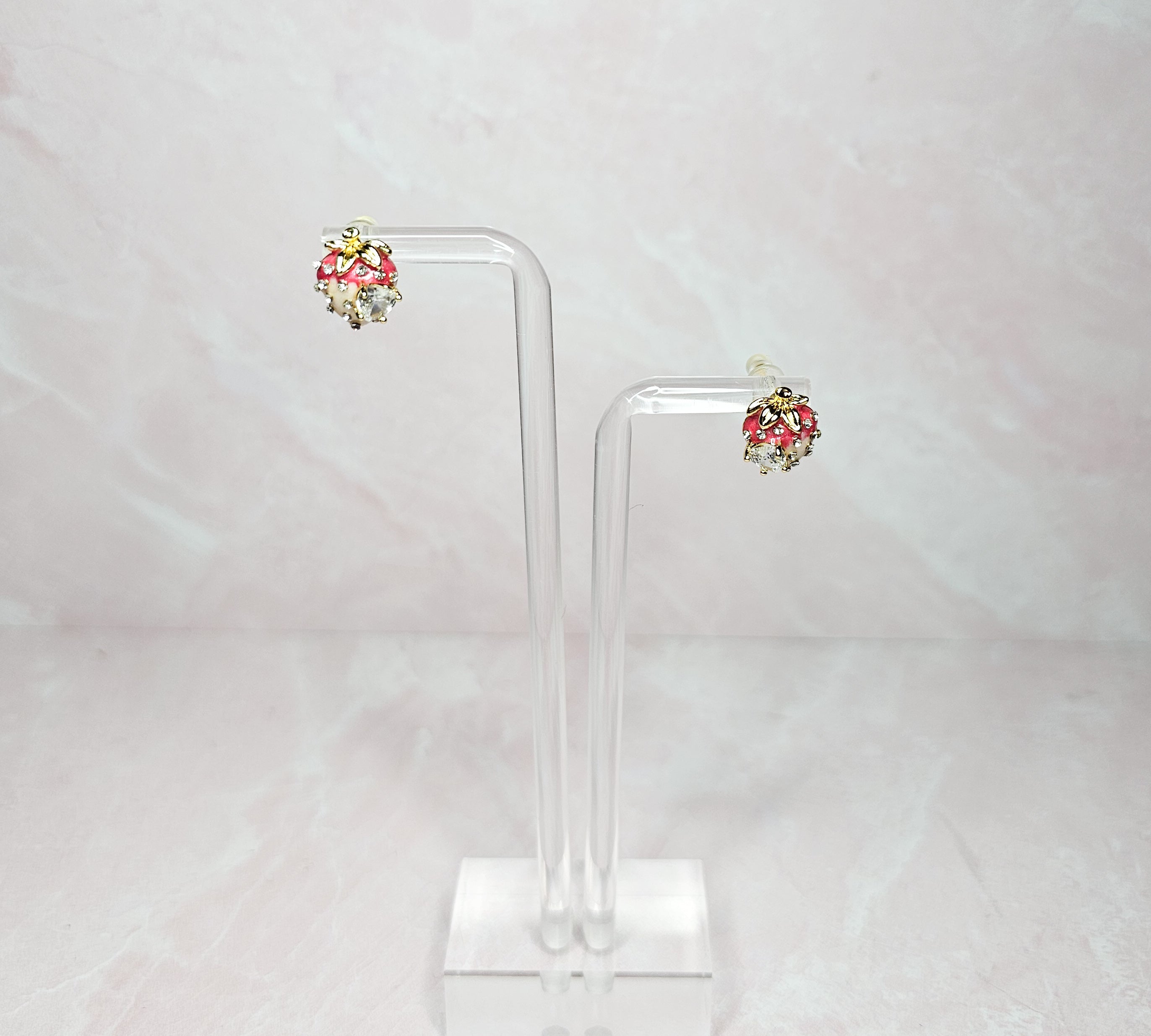 These dainty strawberry stud earrings feature sparkling rhinestones, adding a touch of elegance to any outfit. Made with small, delicate details, these earrings are the perfect accessory for any occasion. Add a sweet and stylish touch to your everyday look with these strawberry studs.