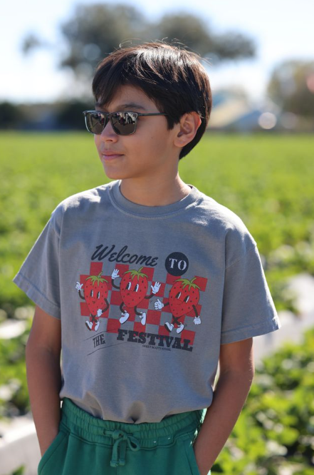 - Get ready to jam in fruity style with the Welcome To The Festival Tee for Youth! This cheeky shirt features animated strawberries strutting their stuff against a groovy checkered backdrop. Perfect for little festival-goers who want to make a splash!