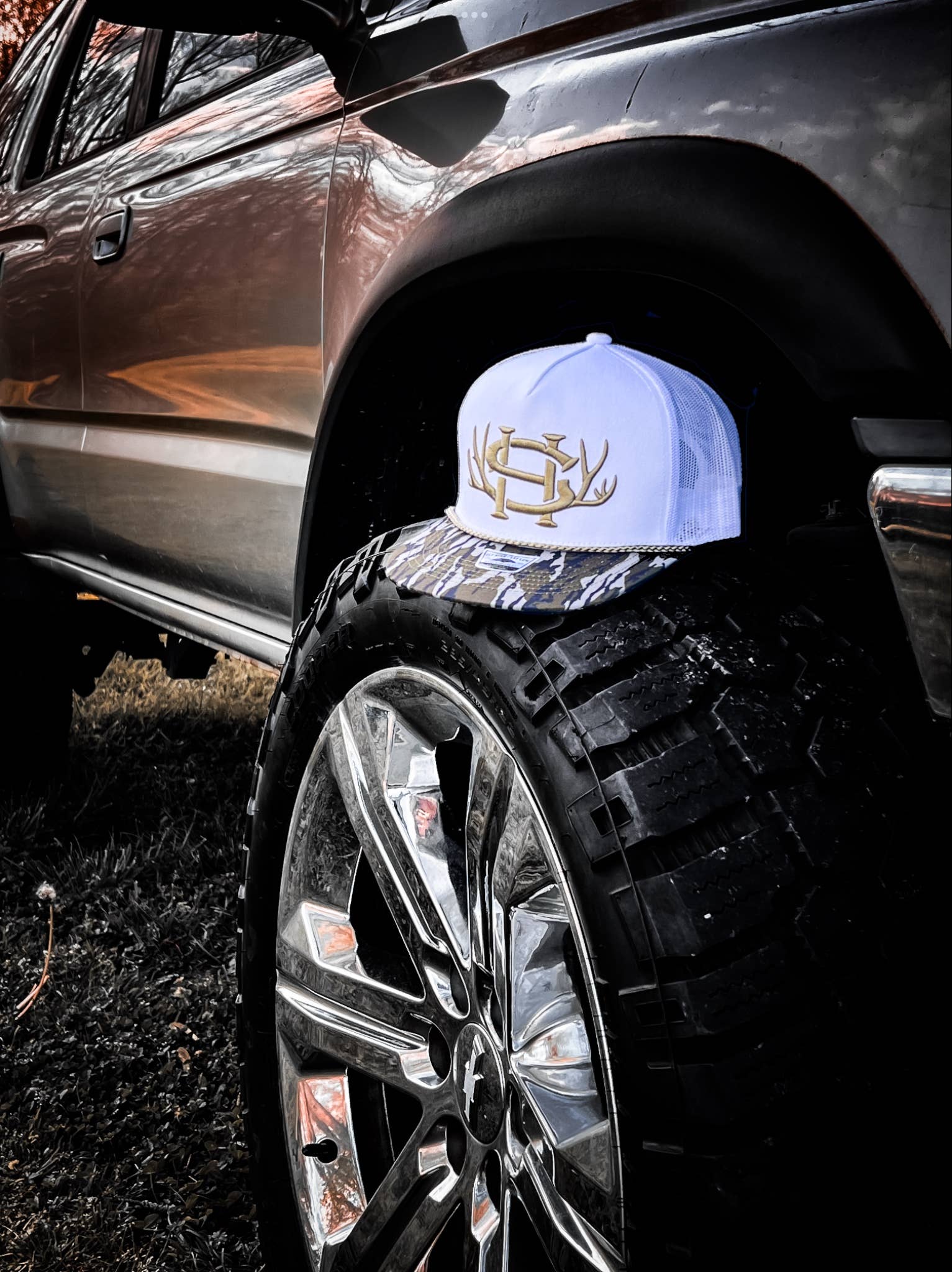 Stay cool and stylish with the In The Wilderness Trucker Hat. Made with a white tall boy design and a bottomland camo bill, this limited edition cap is perfect for any outdoor enthusiast. Be the envy of your friends with this must-have accessory.