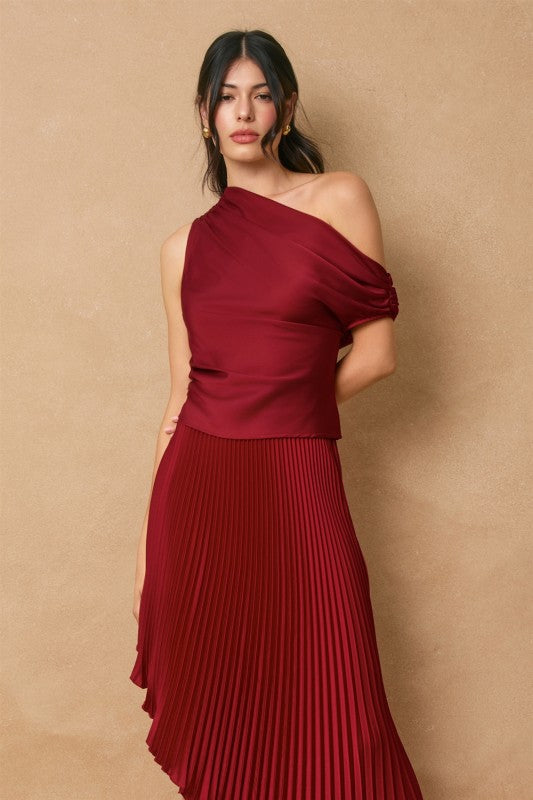 - The Milan Top boasts a 100% polyester fabric that offers both lightweight comfort and breathability. Its elegant color and sleeveless style make it a versatile option for any event. Stay chic and at ease with this satin top, featuring an asymmetrical one-shoulder design and shirring detail on the sleeves.