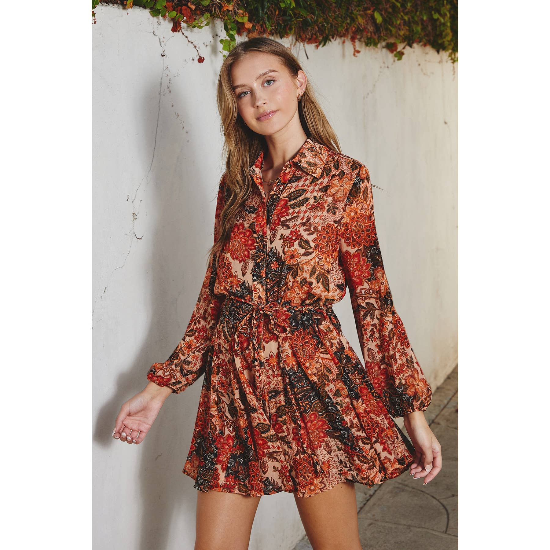 - Featuring a beautiful paisley print, this dress is complete with a button down front, a collared neckline, and a self braided belt for a sophisticated touch. The long button cuffed sleeves and fully lined flared mini skirt add the perfect finishing touches to this must-have piece.