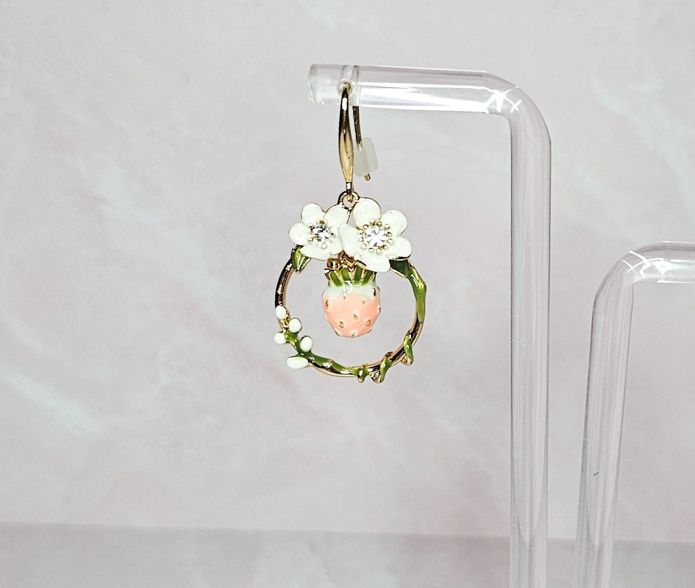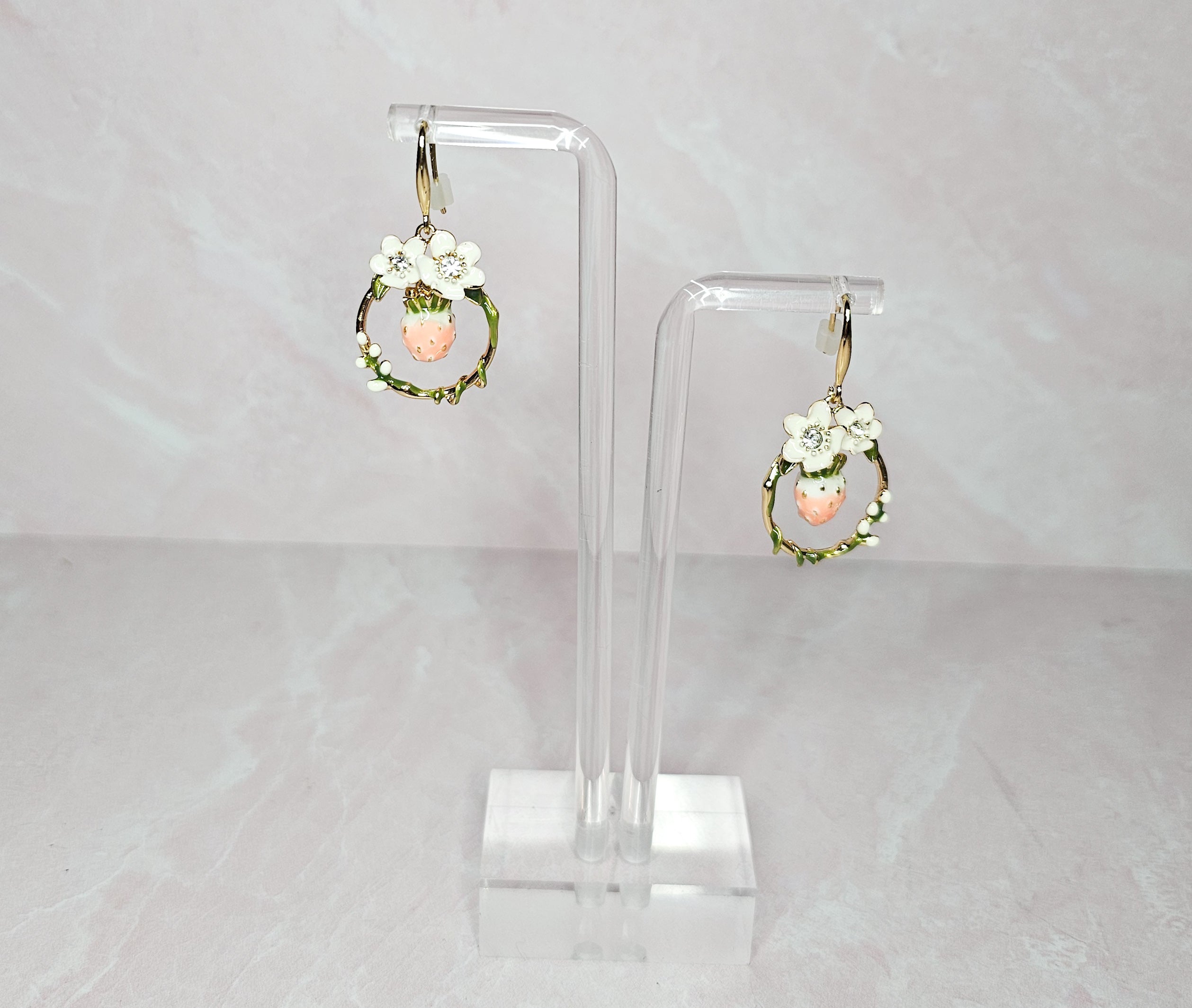 Add a touch of sweetness with these delicate strawberry earrings. Handcrafted with white flowers, these earrings are a unique and elegant addition to any outfit. Perfect for nature lovers and those who appreciate the finer details.