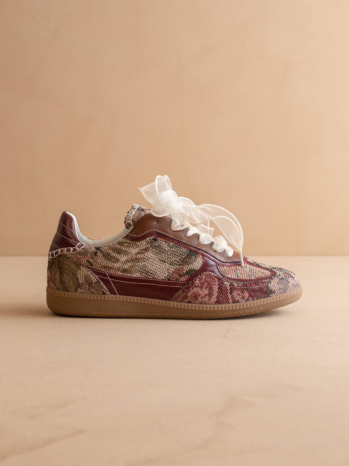 Step into style with The Dalia Sneaker. This vintage-inspired lace-up silhouette is perfect for any occasion, with two sets of laces included. The contrast leather trim adds a touch of sophistication, while a cushioned sole guarantees all-day comfort. Made with a tapestry print upper a for a one-of-a-kind look and feel.