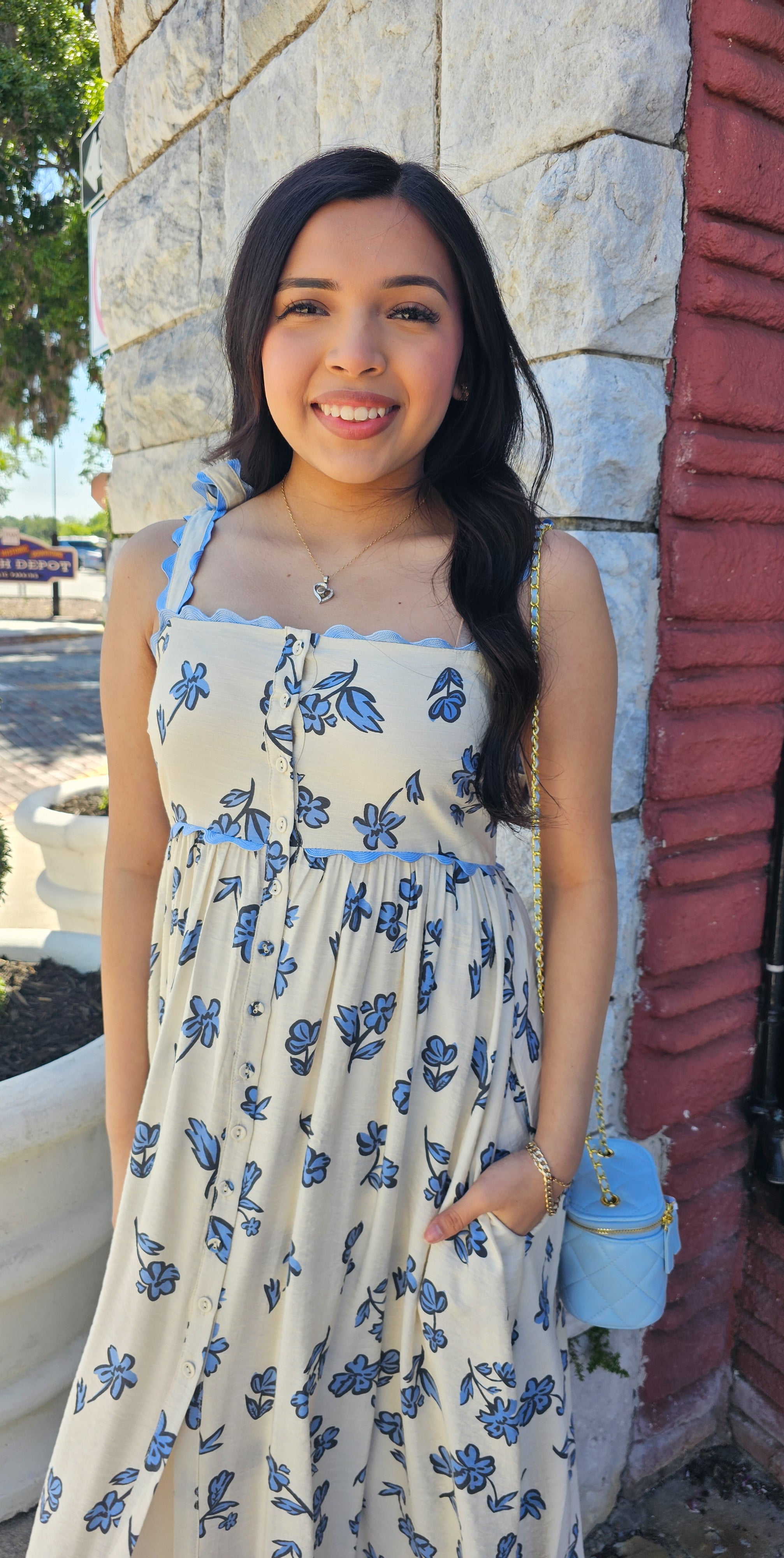 Description:Expertly crafted for a perfect blend of style and comfort, the De La Luna Dress is designed with a stunning floral print and a button-down front. The midi length, shoulder ties, and scallop trim detail offer a flattering silhouette, while pockets and a front slit provide functionality. Lined for a smooth fit, this dress is a must-have for any wardrobe.