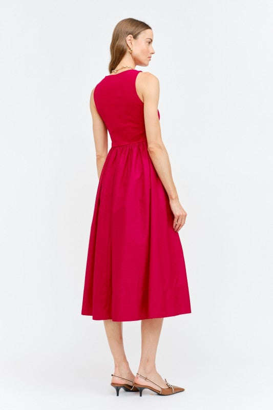 - Expertly crafted for versatility and style, our Leslie Dress boasts a high neckline and sleeveless design. The combination midi dress is perfect for any occasion, offering both elegance and comfort in equal measure. Stand out in bold, sophisticated fashion with this must-have piece.