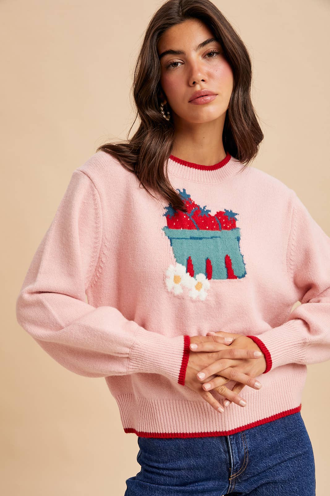 - Description:The Emma Berry Sweater is a perfect addition to your wardrobe, with its long sleeves and round neck for a comfortable fit. The unique strawberry buck in the middle adds a touch of charm and style. Made with high-quality materials, it's both functional and fashionable.
