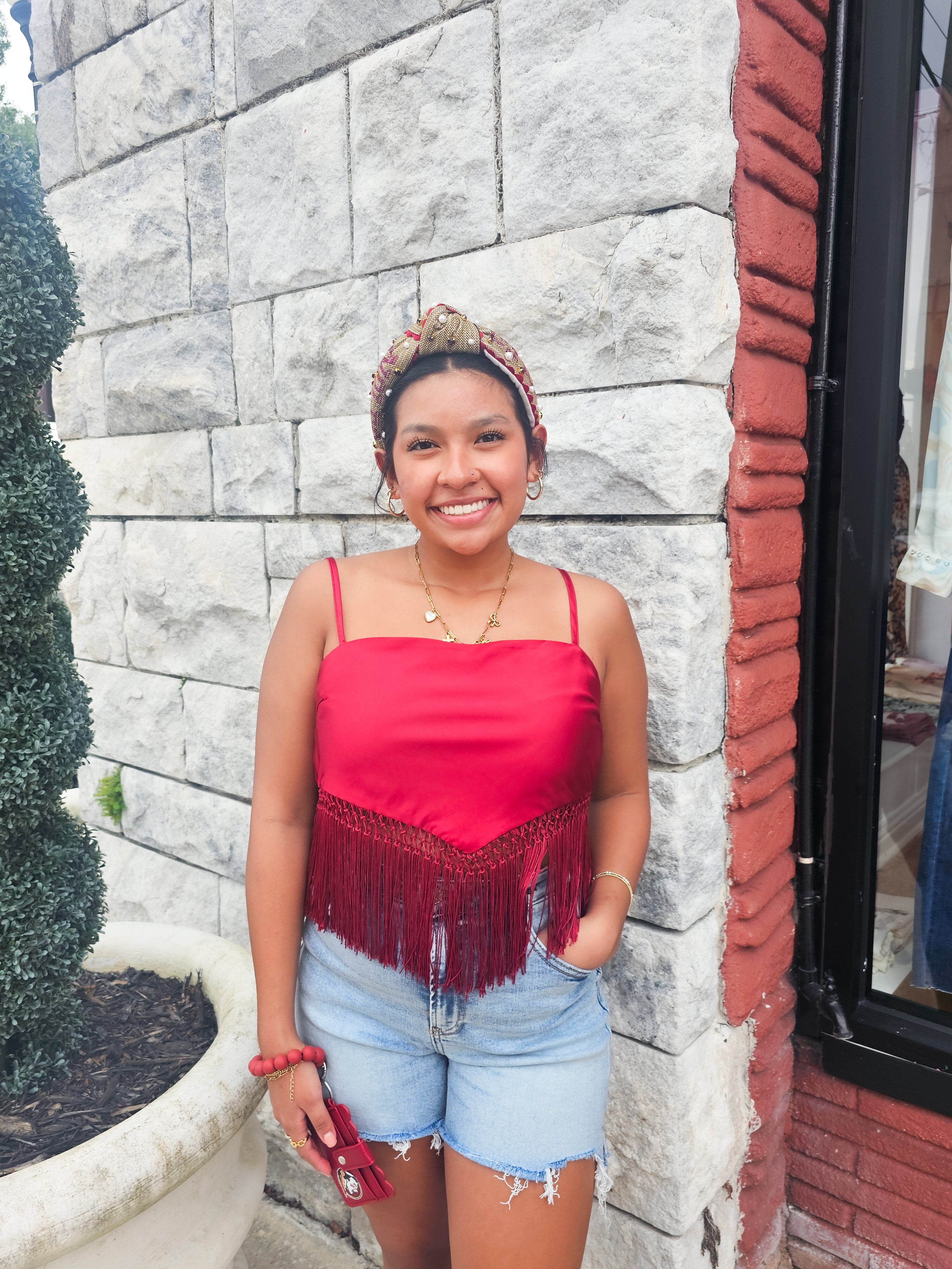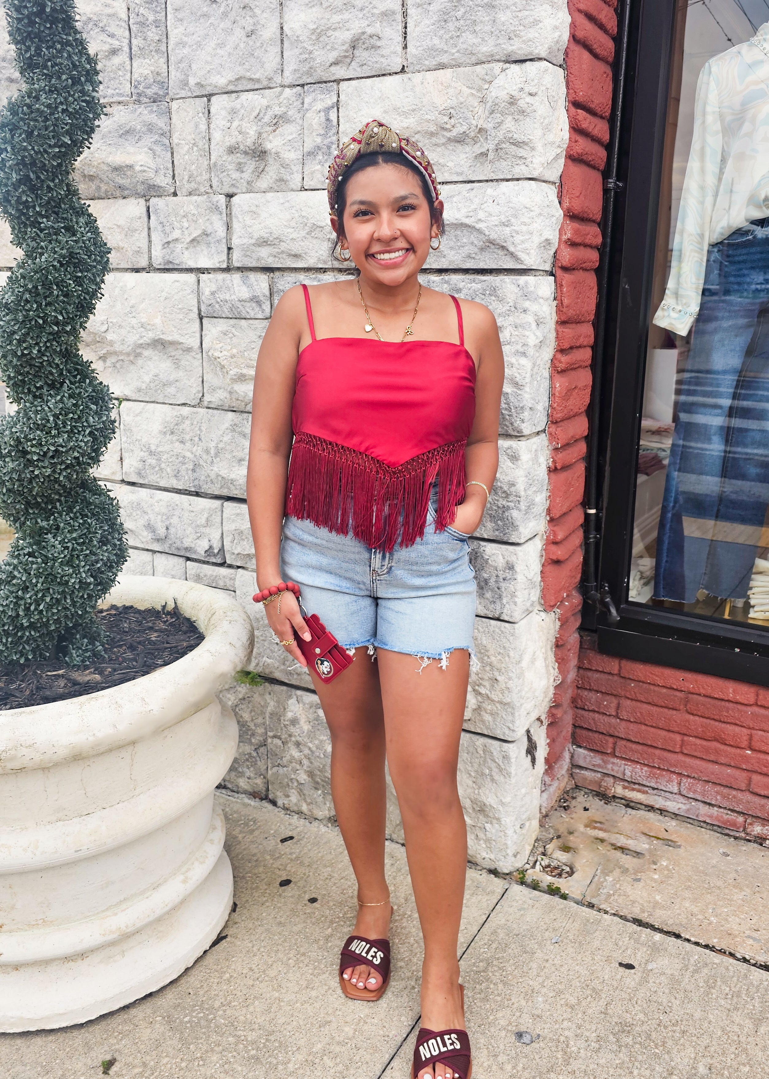 - Description: Expertly designed for the modern woman, the Wesley Top Burgundy is the perfect statement piece for any occasion. The strapless and sleeveless design allows for effortless style, while the fringe top adds a touch of bohemian charm. Elevate your wardrobe with this must-have piece.