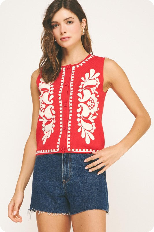 • Description:The Felicity Vest Top features an elegant embroidered design in striking red and white colors, making it a stylish addition to any wardrobe. With its sleeveless design, it offers a comfortable and flattering fit for any occasion. Upgrade your look with the Felicity Vest Top.