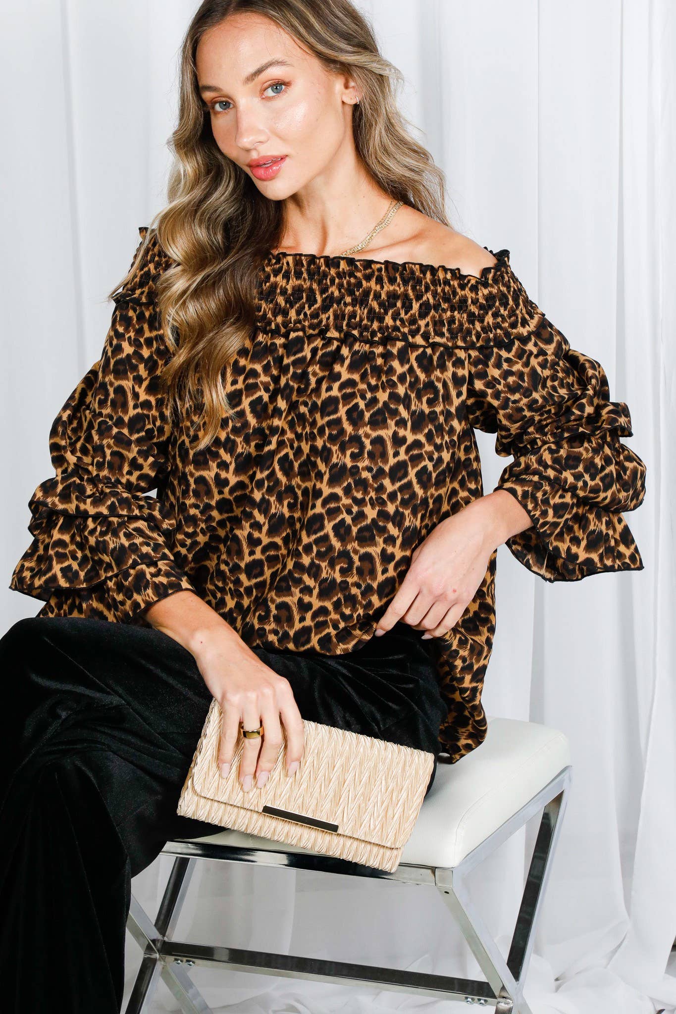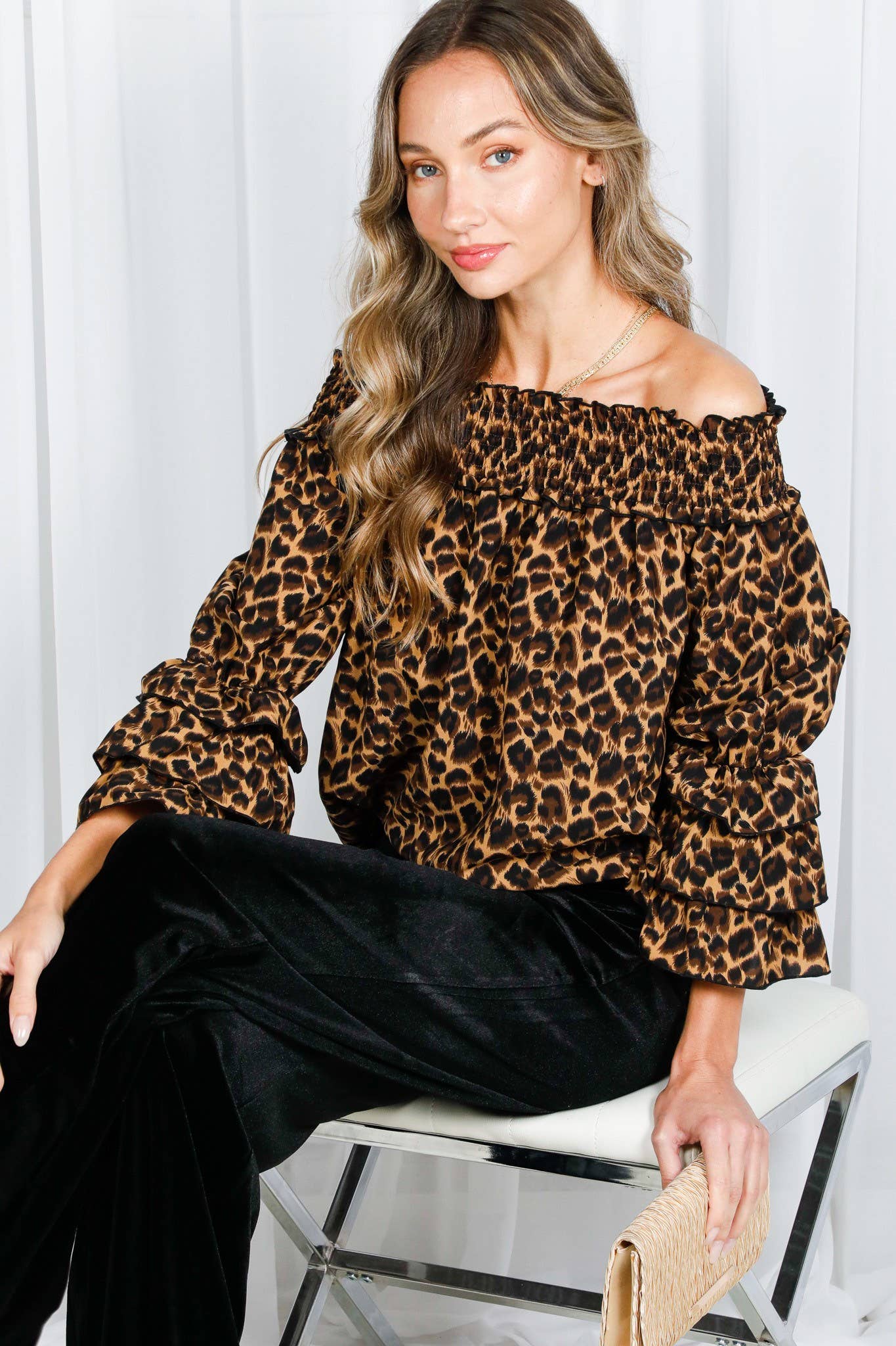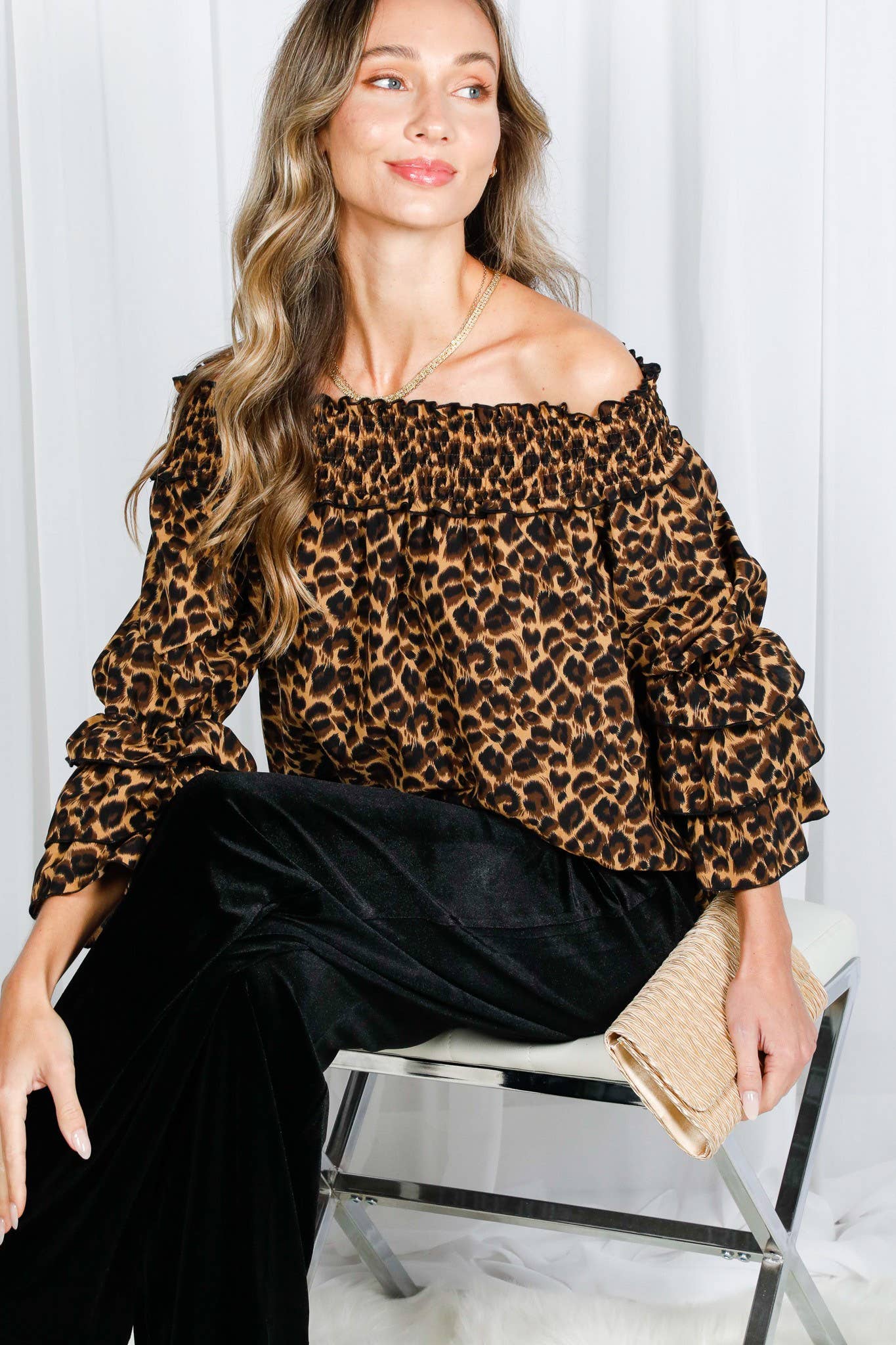 - Elevate your style with this chic and sophisticated leopard blouse top. The off-the-shoulder ruffled neckline and smocked detail create a flattering look, while the trendy leopard print adds a touch of fashion-forward appeal. Perfect for any occasion, this blouse is sure to make a statement.