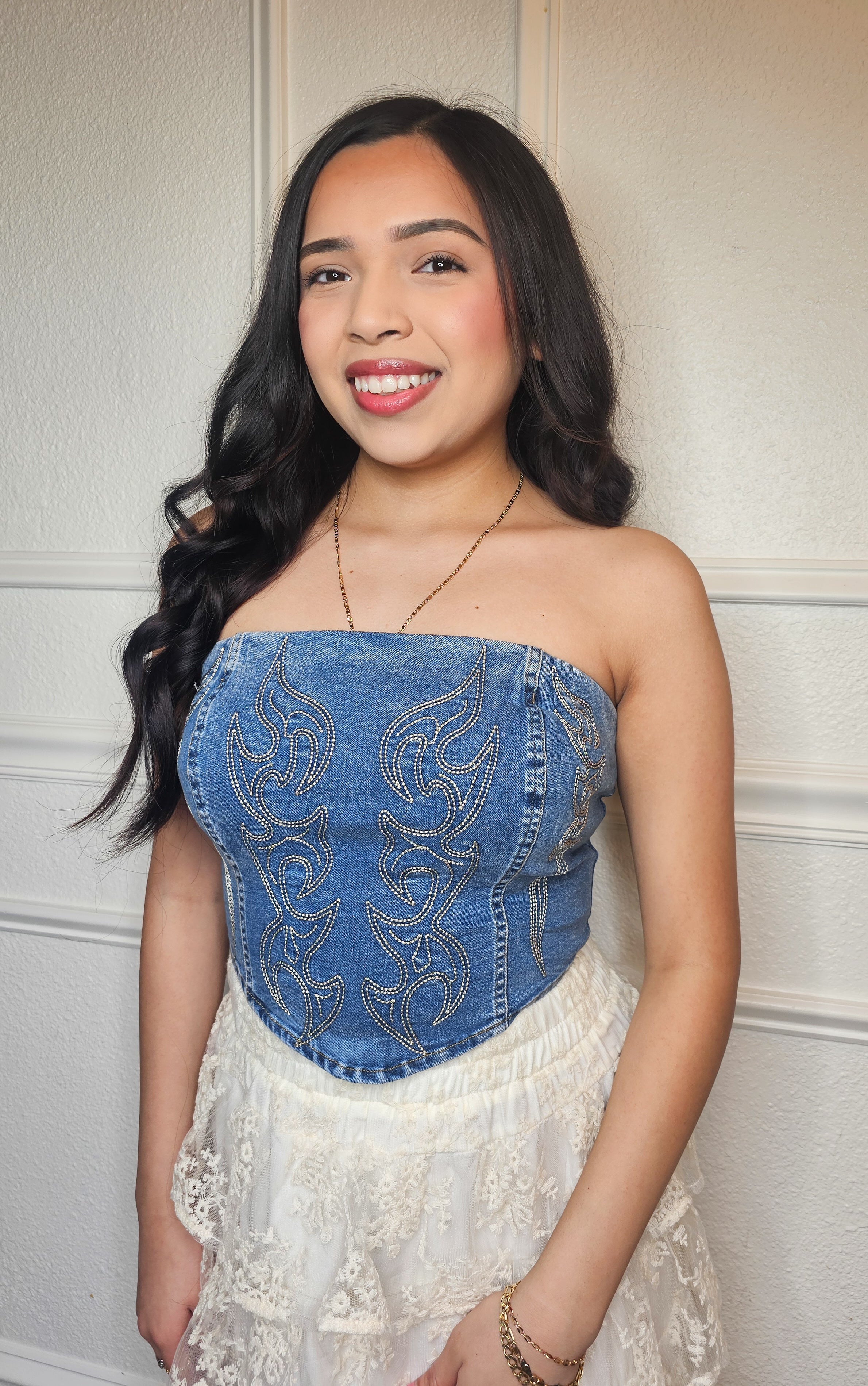 Designed for style and comfort, the Riley Top features a mid stone wash, boot stitch embroidery, and a corset design. Made with super stretchy denim for a flattering and comfortable fit. Upgrade your wardrobe with this must-have piece.