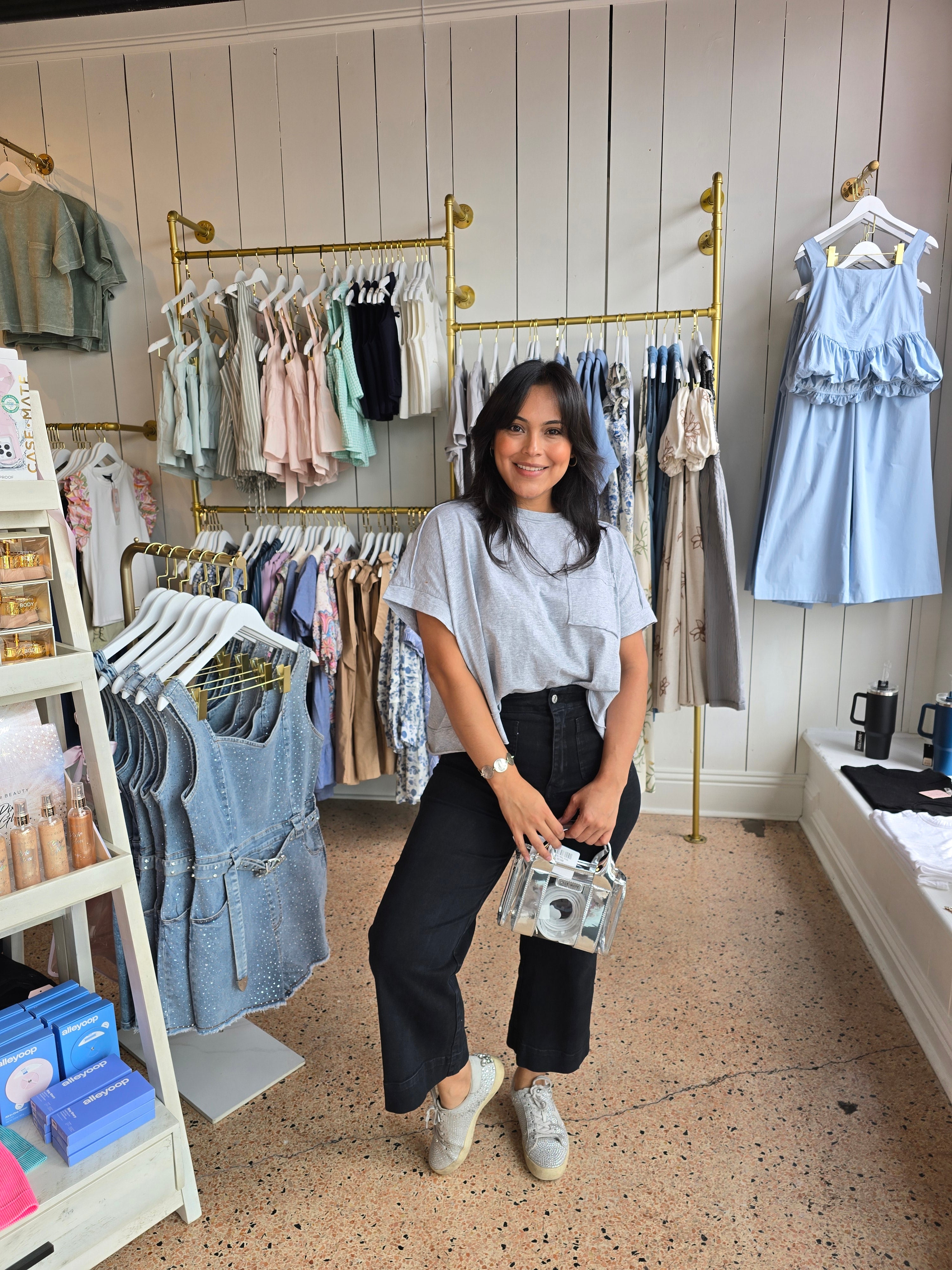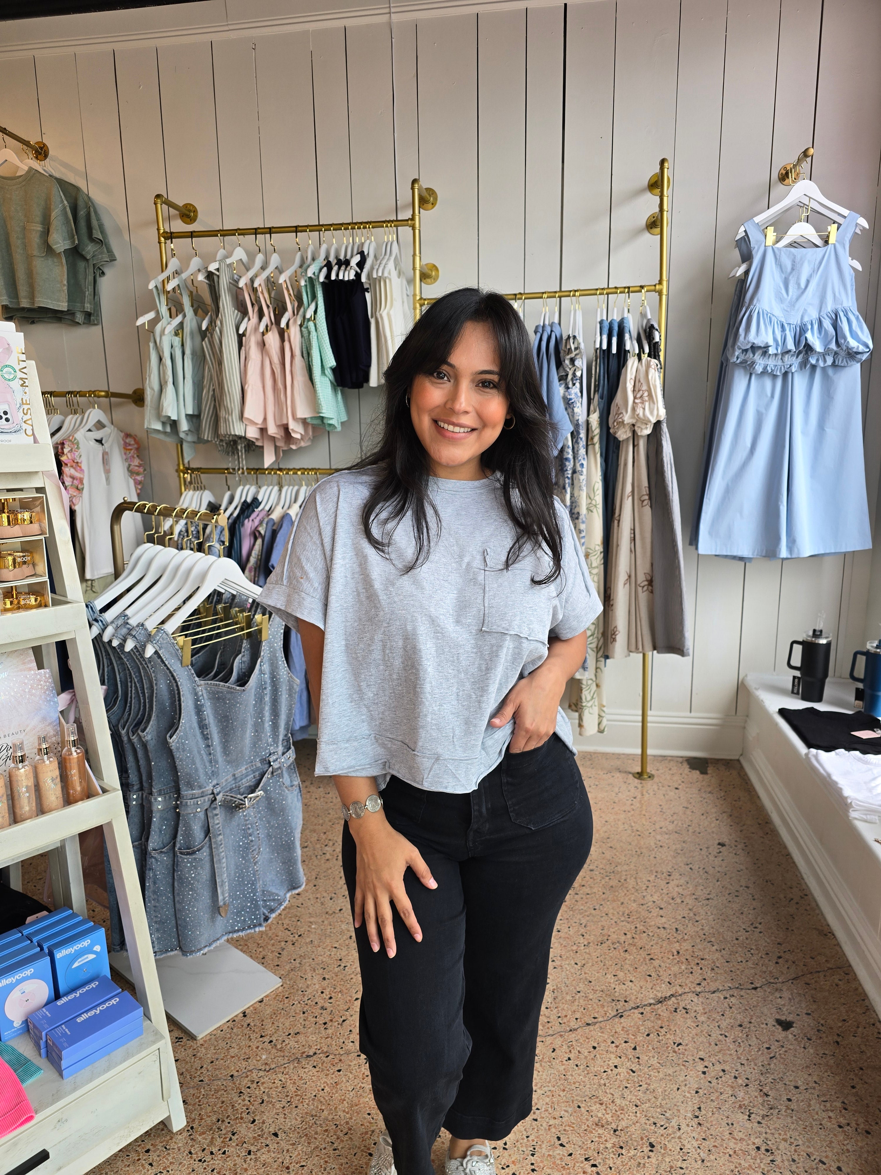 - This grey pocket cropped tee in an oversized fit is the perfect addition to any casual outfit. Made with comfortable and breathable fabric, it features a flattering cropped length and a convenient pocket. Its versatile design and bold green color make it a must-have in any fashion-forward wardrobe.