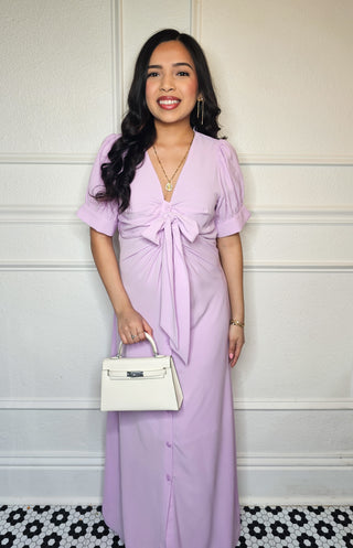 - Description:Elevate your style with our long lavender dress. Featuring a v-neck and a convenient button up front, this dress offers both elegance and functionality. Made from high-quality fabric, it's perfect for any occasion. Step out in confidence and comfort with our dress.