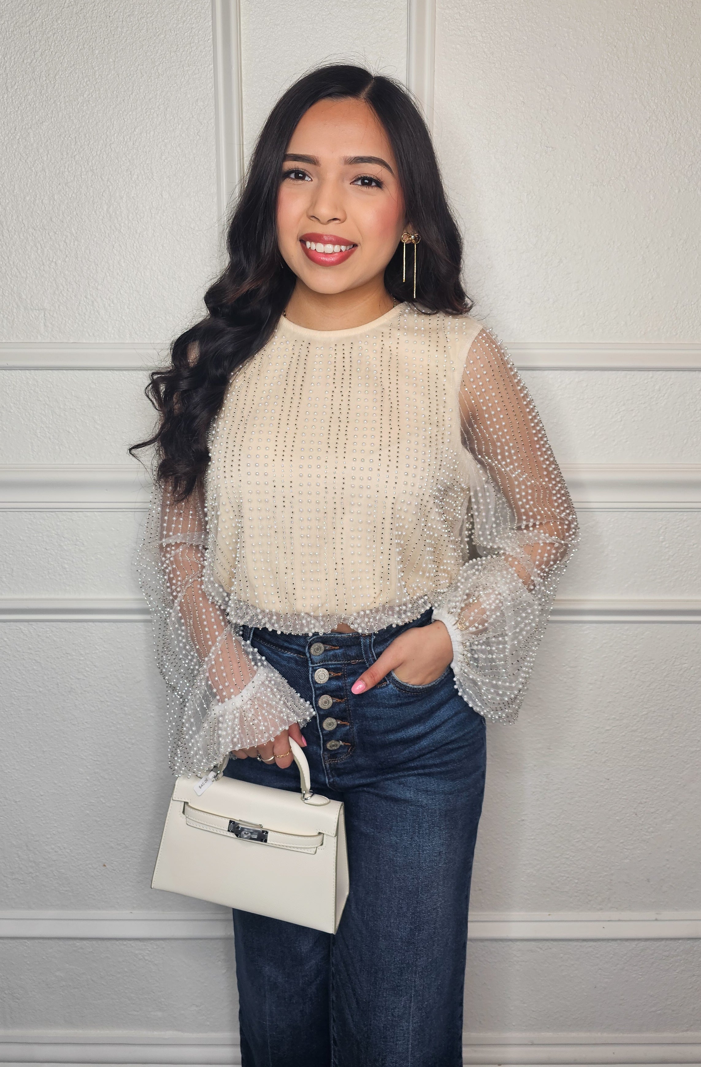 - Description: Discover the elegance and sophistication of our In The Spotlight Top. This stunning long sleeve blouse is adorned with exquisite bead and pearl embellishments, adding a touch of glamour to any outfit. Complete with a convenient back button closure, this top is the perfect addition to your wardrobe.