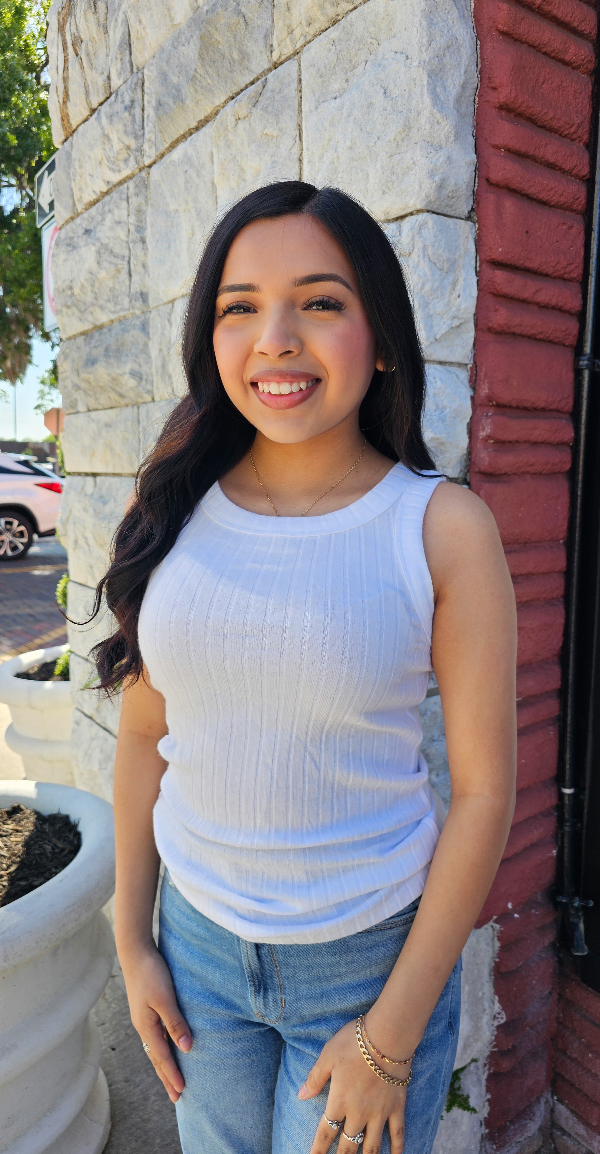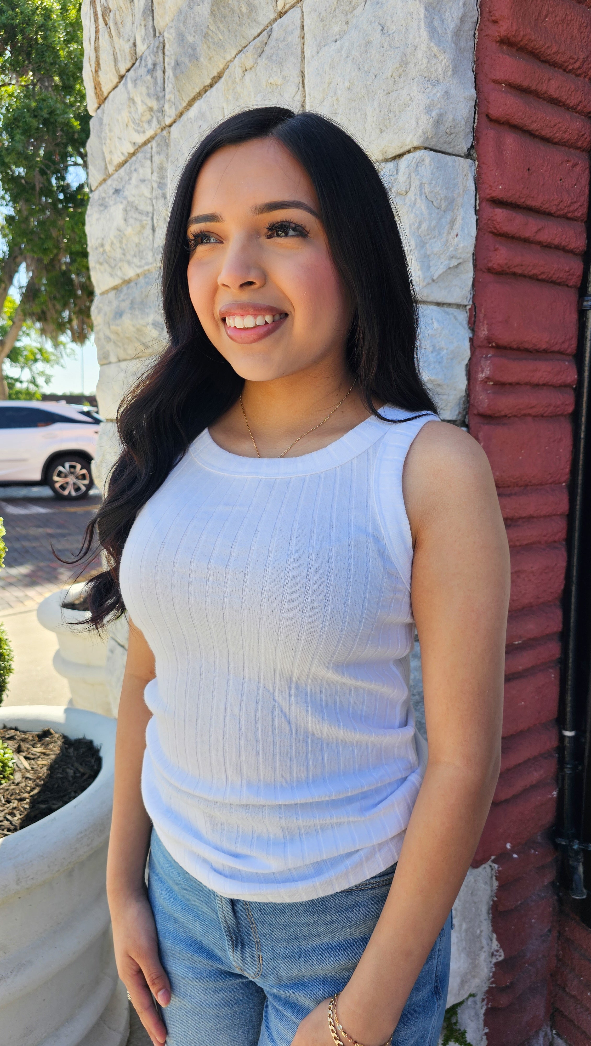 - Introducing the Kai Top in White. This fitted ribbed tank top features a scoop neck and sleeveless design, providing a flattering and comfortable fit. Elevate your wardrobe with this versatile and stylish top.