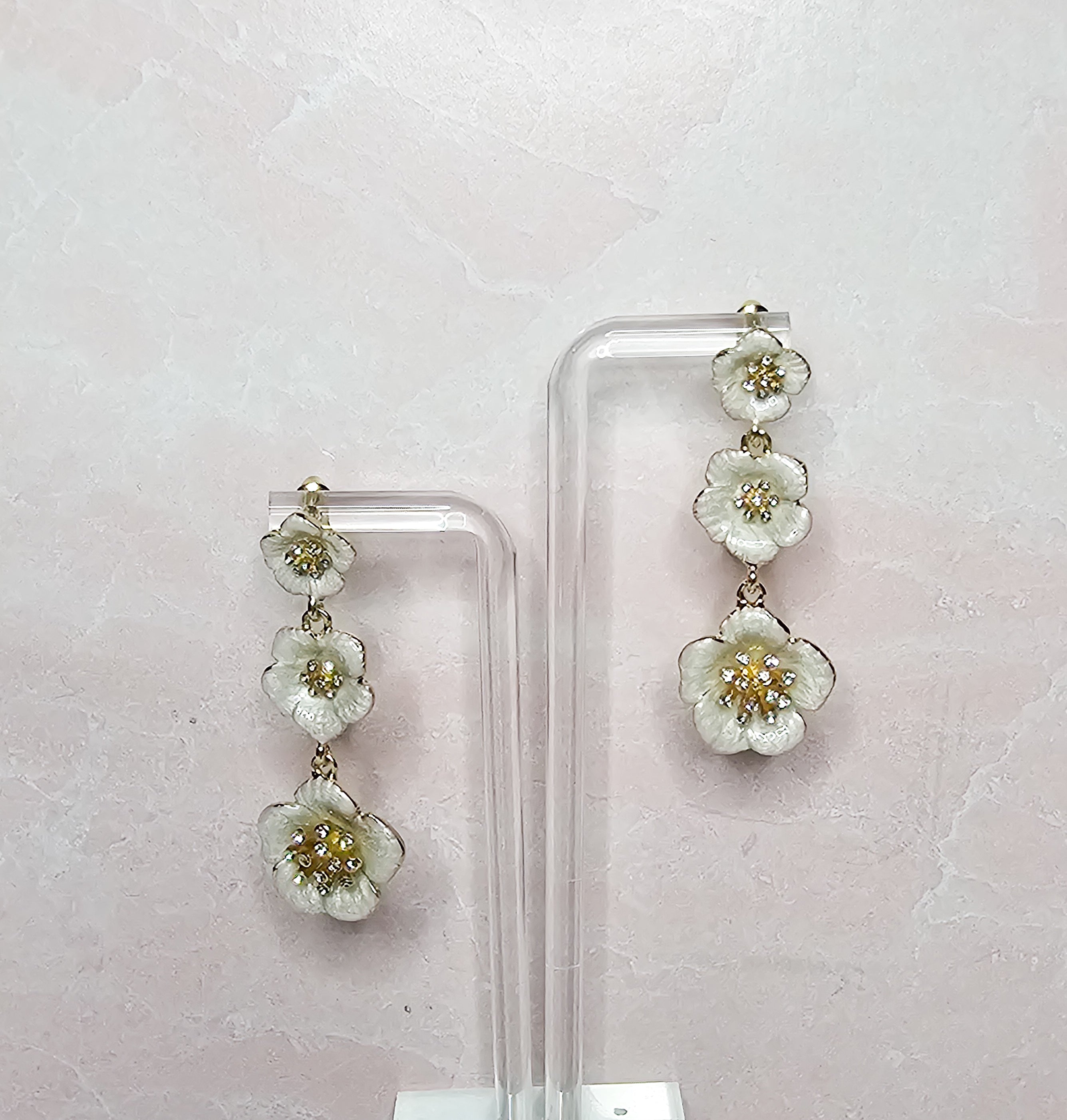Expertly crafted 3 tier flower earrings with elegant white flowers and sparkling rhinestones. Enhance any outfit with these stunning statement earrings. Perfect for adding a touch of sophistication and glamour.