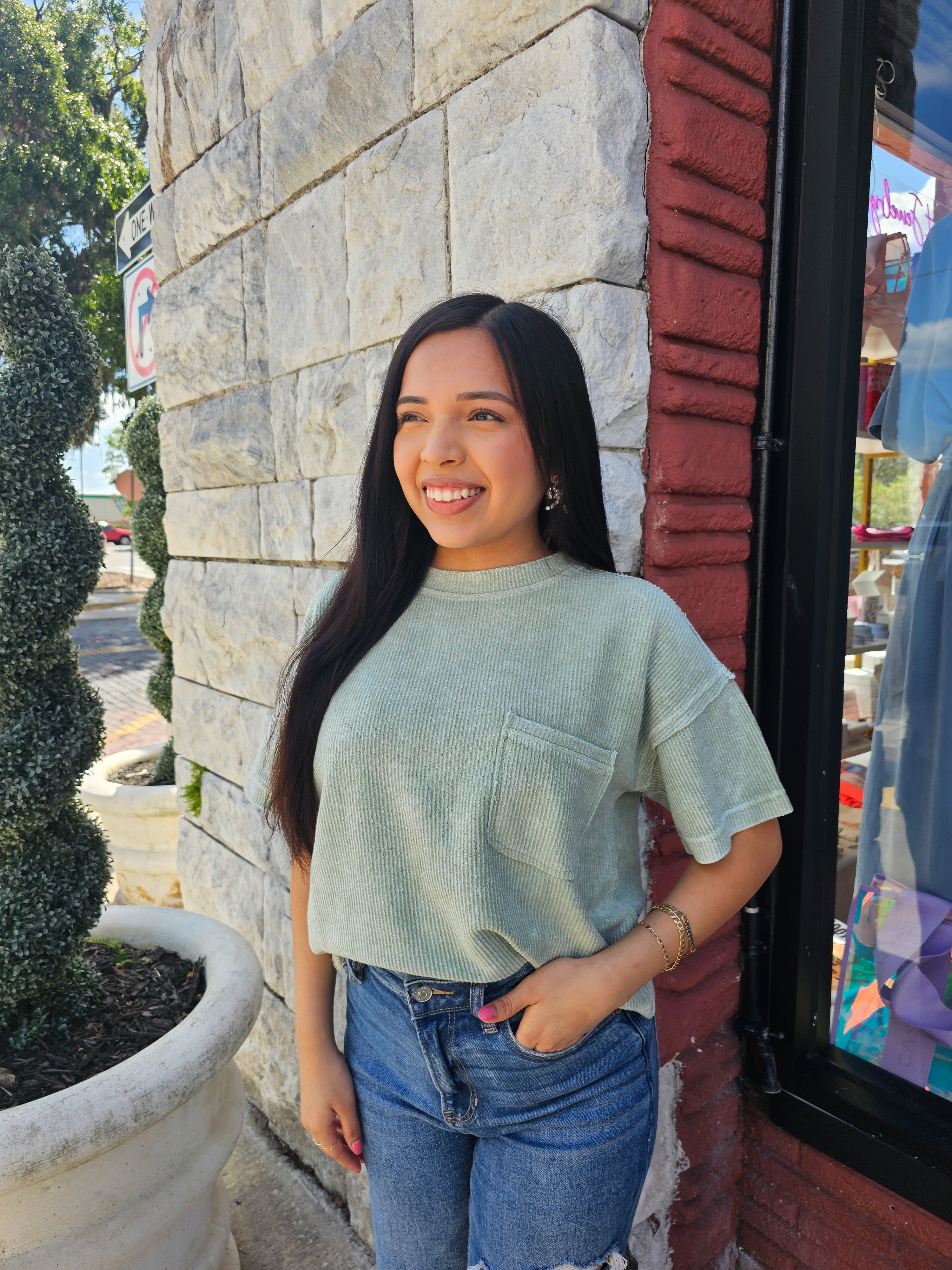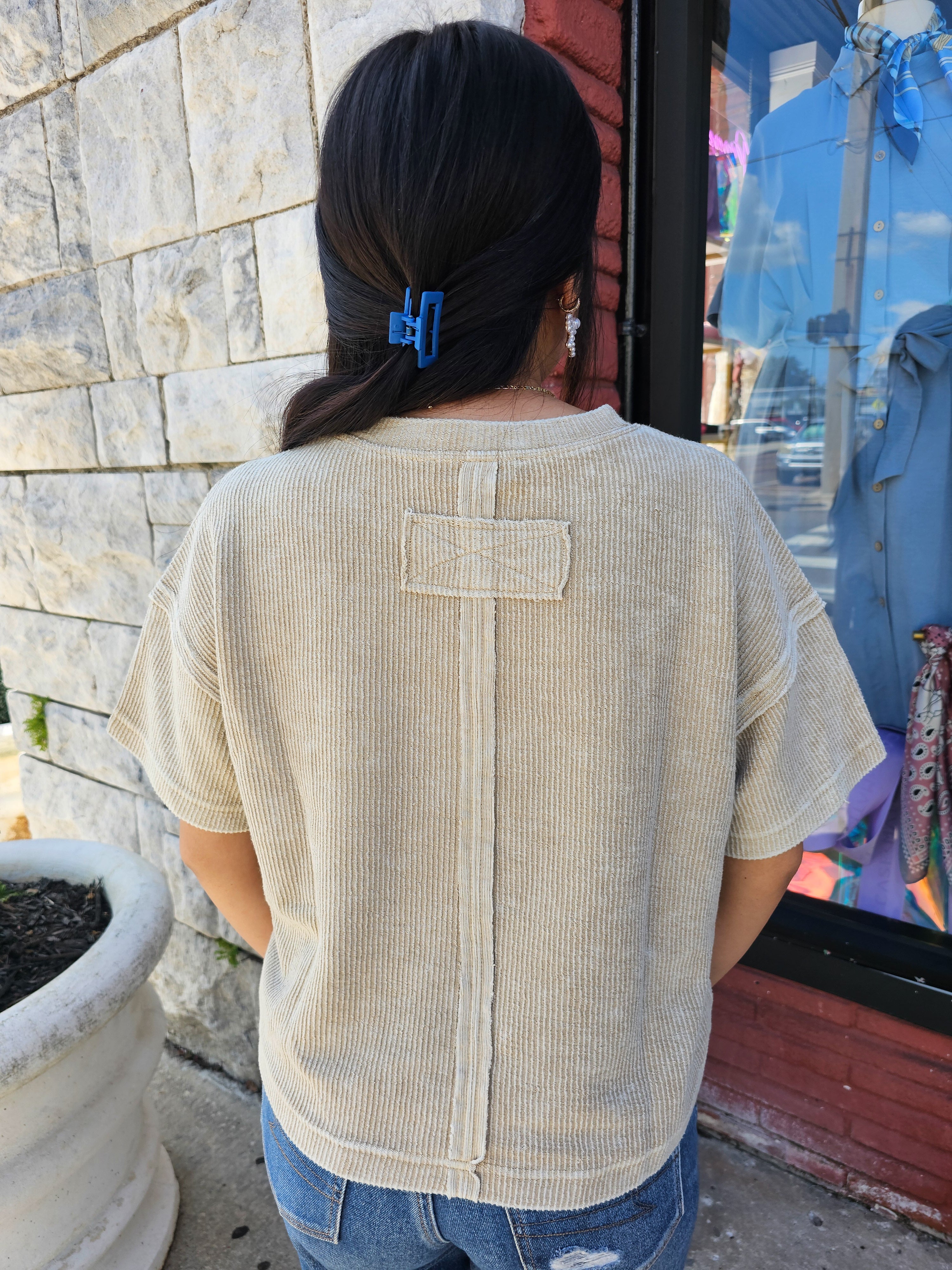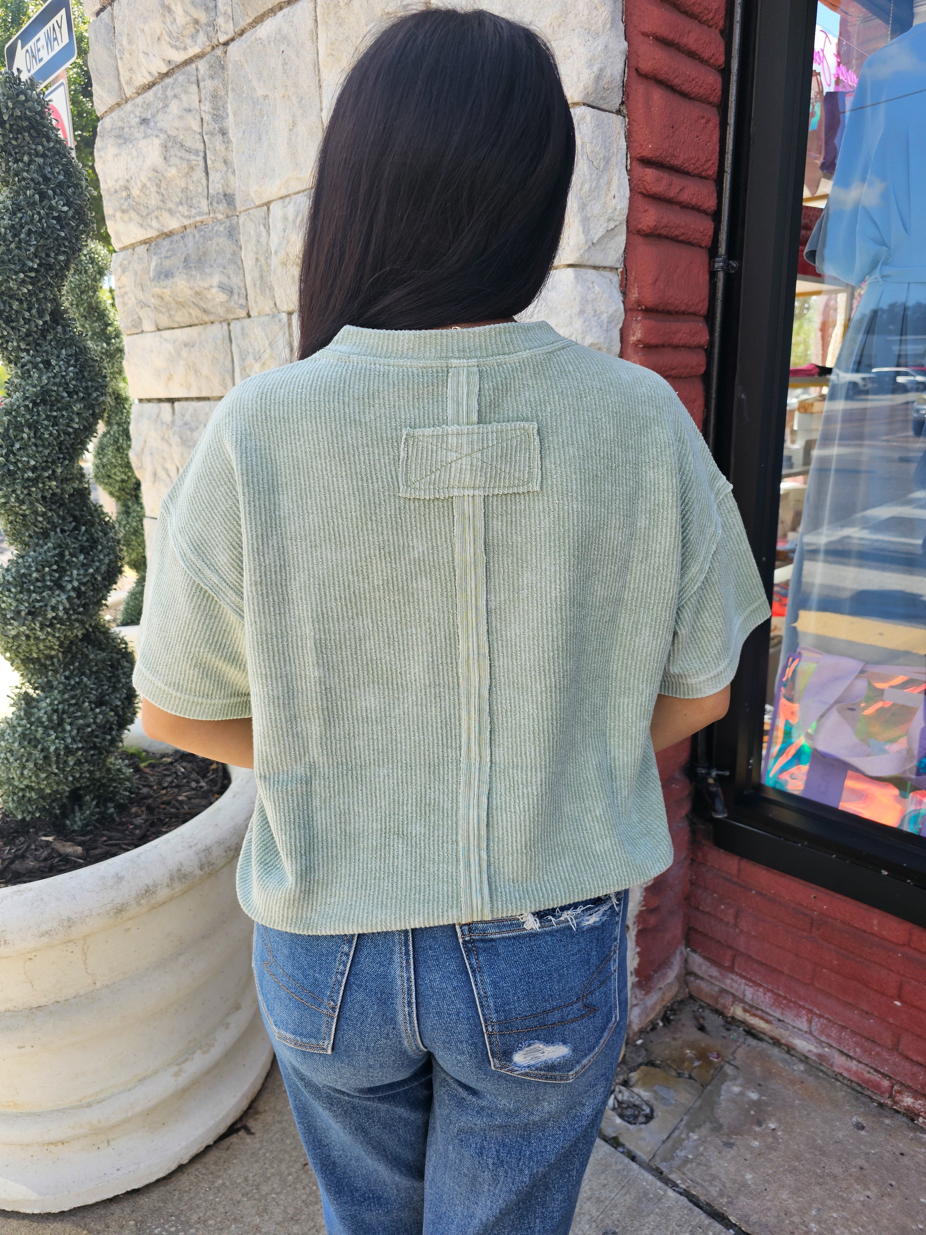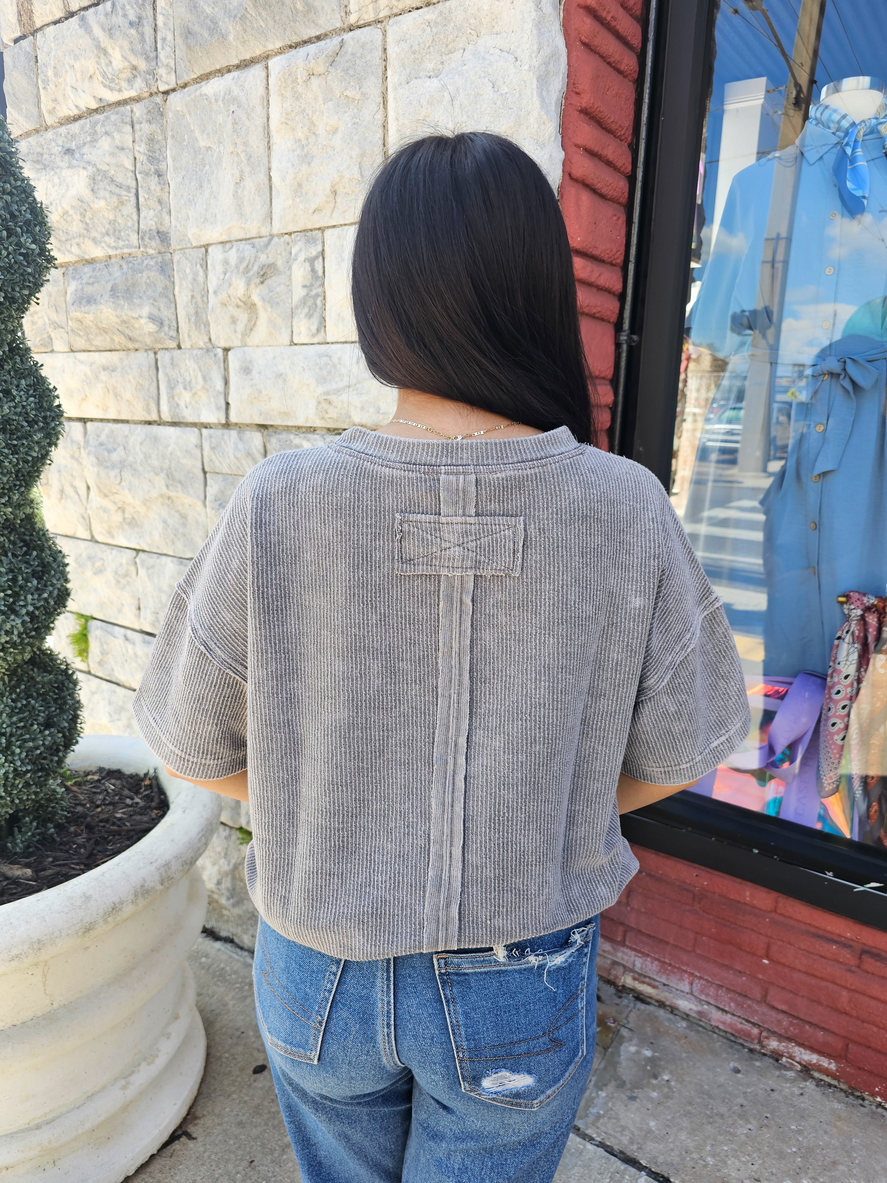 - Expertly designed with a relaxed fit, this top features a round neckline and short sleeves for a comfortable and stylish wear. The dropped shoulder and exposed seam add a touch of modernity to the washed ribbed pattern. With a lined raw edge, this versatile top is ideal for any occasion.