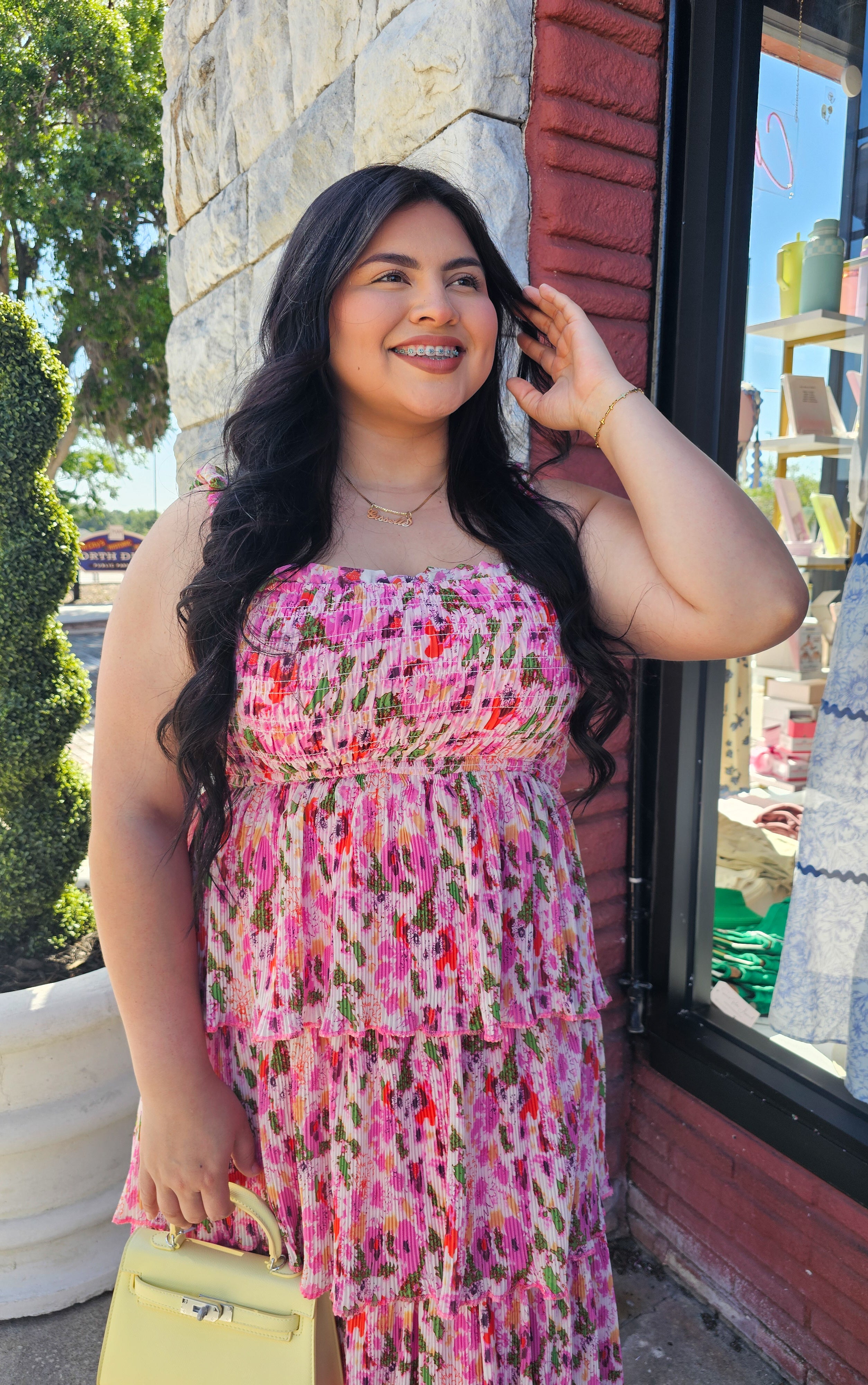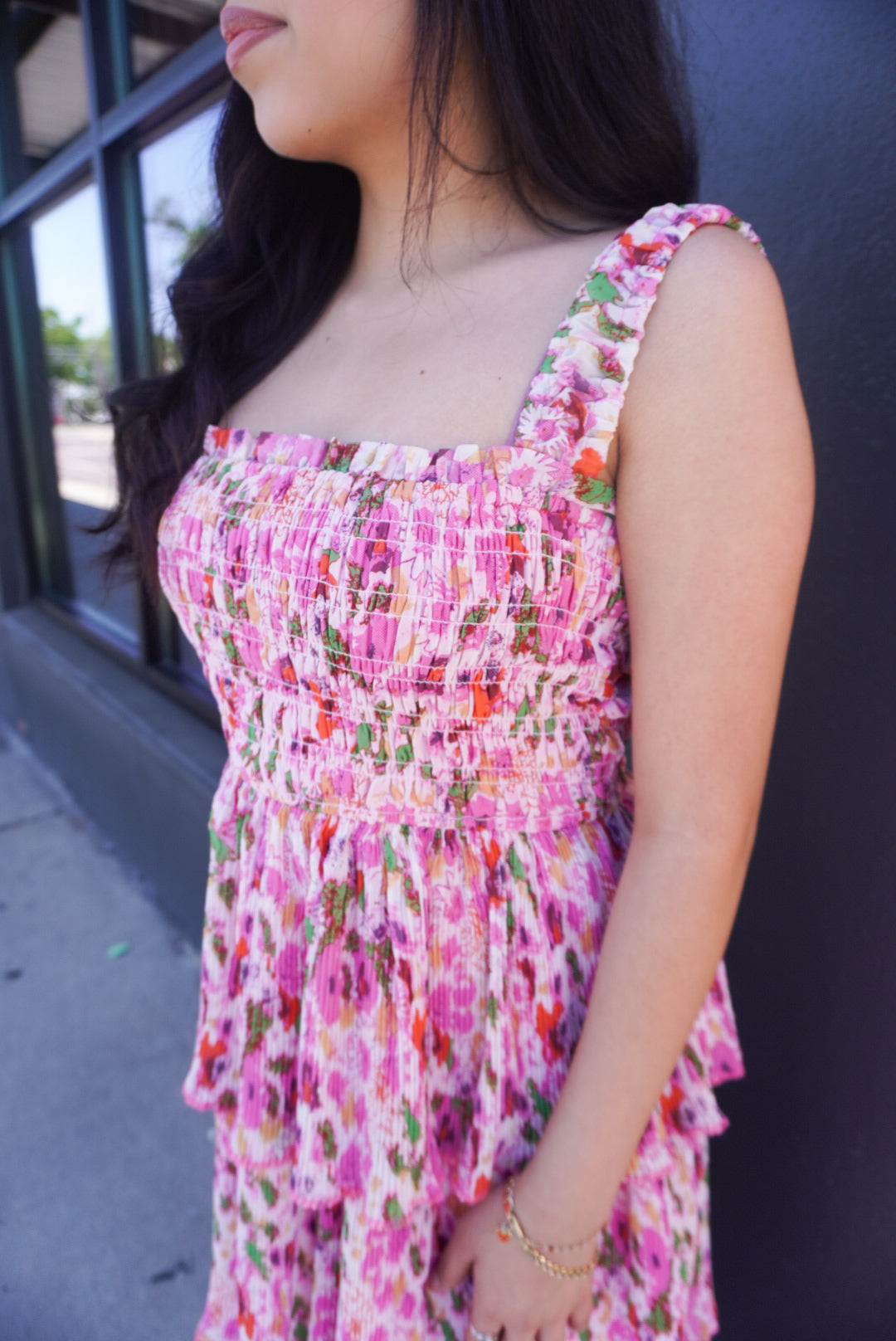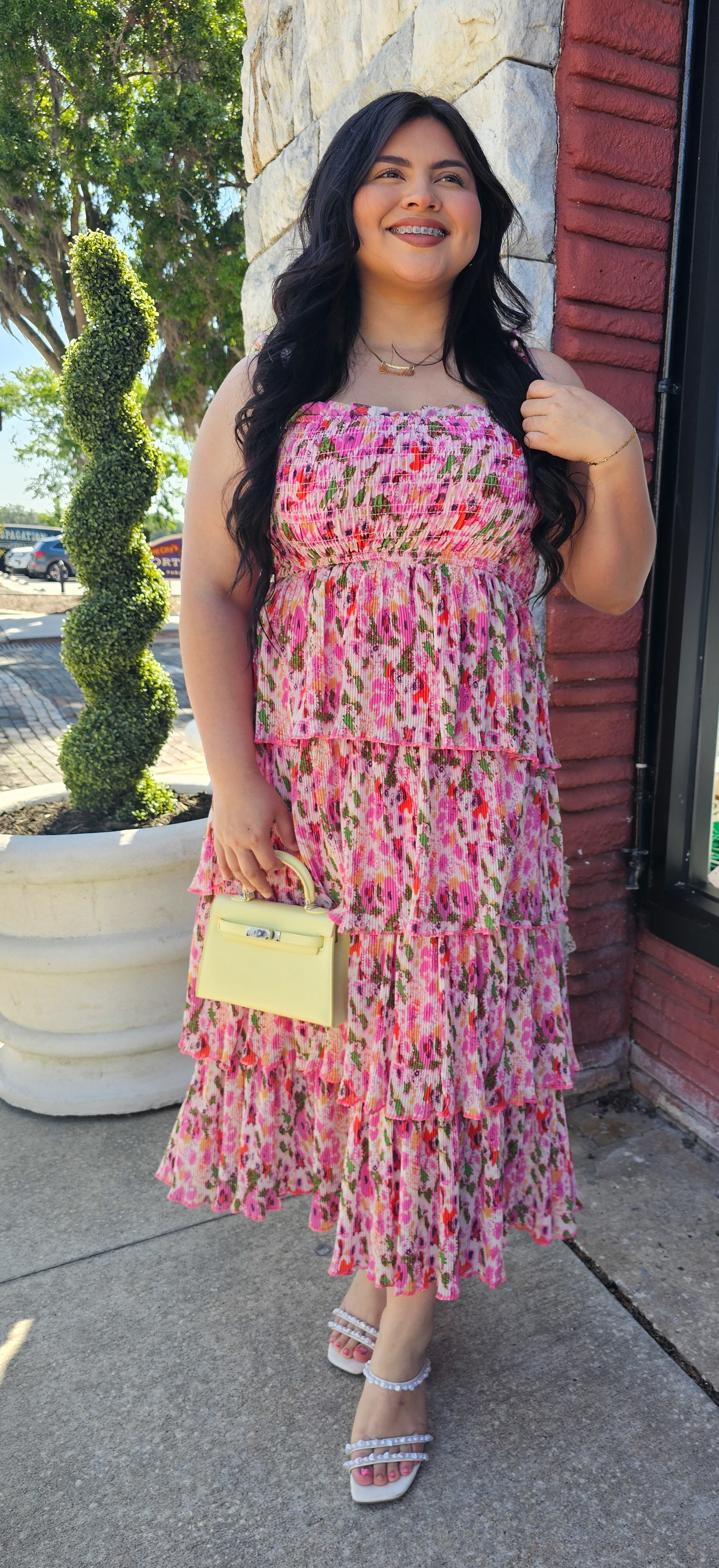 - Description: long dress features a captivating floral print and a smocked tiered design, perfect for a stylish and comfortable look. Made with quality materials, it offers effortless elegance for any occasion. Experience the chic and flattering fit of this must-have dress.