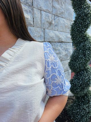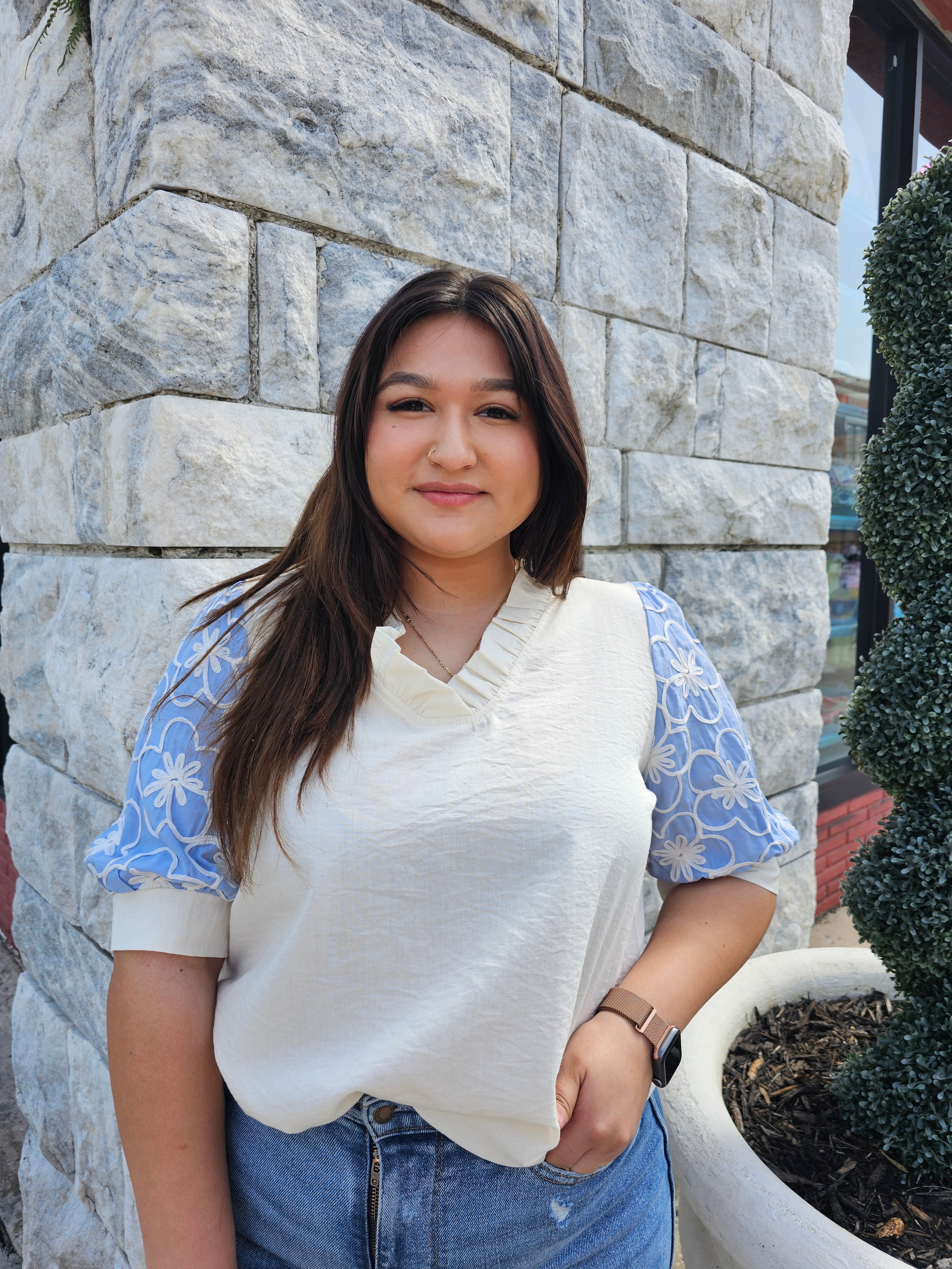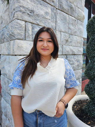 - Discover the perfect blend of sophistication and elegance with our Not So Basic Top. This solid woven top features a flattering ruffled v neck and playful puff sleeves adorned with delicate flower details. Elevate your wardrobe with this must-have piece.