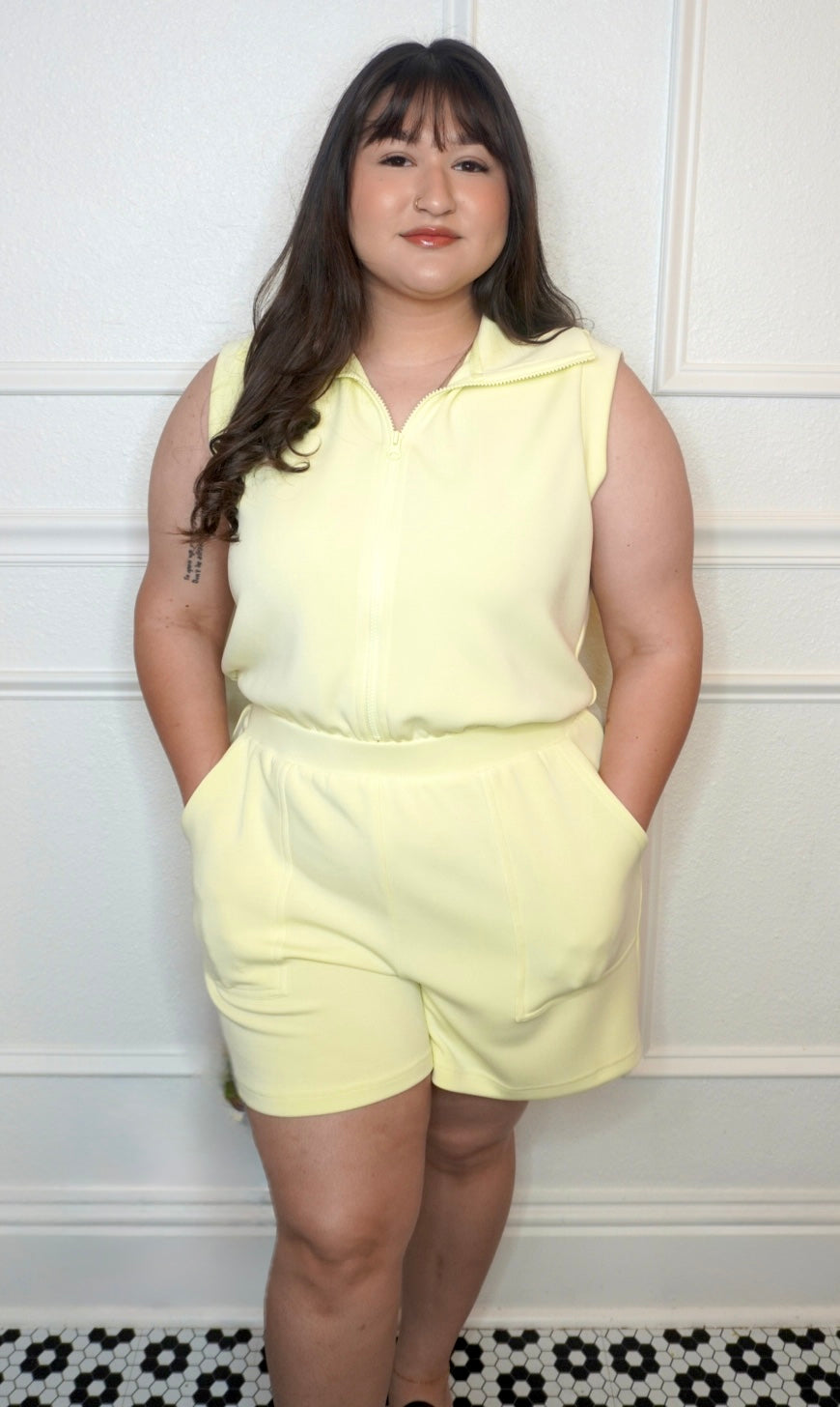 - The Olivia Romper is the perfect blend of comfort and style. Made with soft fabric, this romper features a collared neckline and a convenient zip-up design. The cinched elastic waistband not only adds a flattering touch but also ensures a comfortable fit. With front and faux back pockets, this sleeveless romper is both practical and chic.