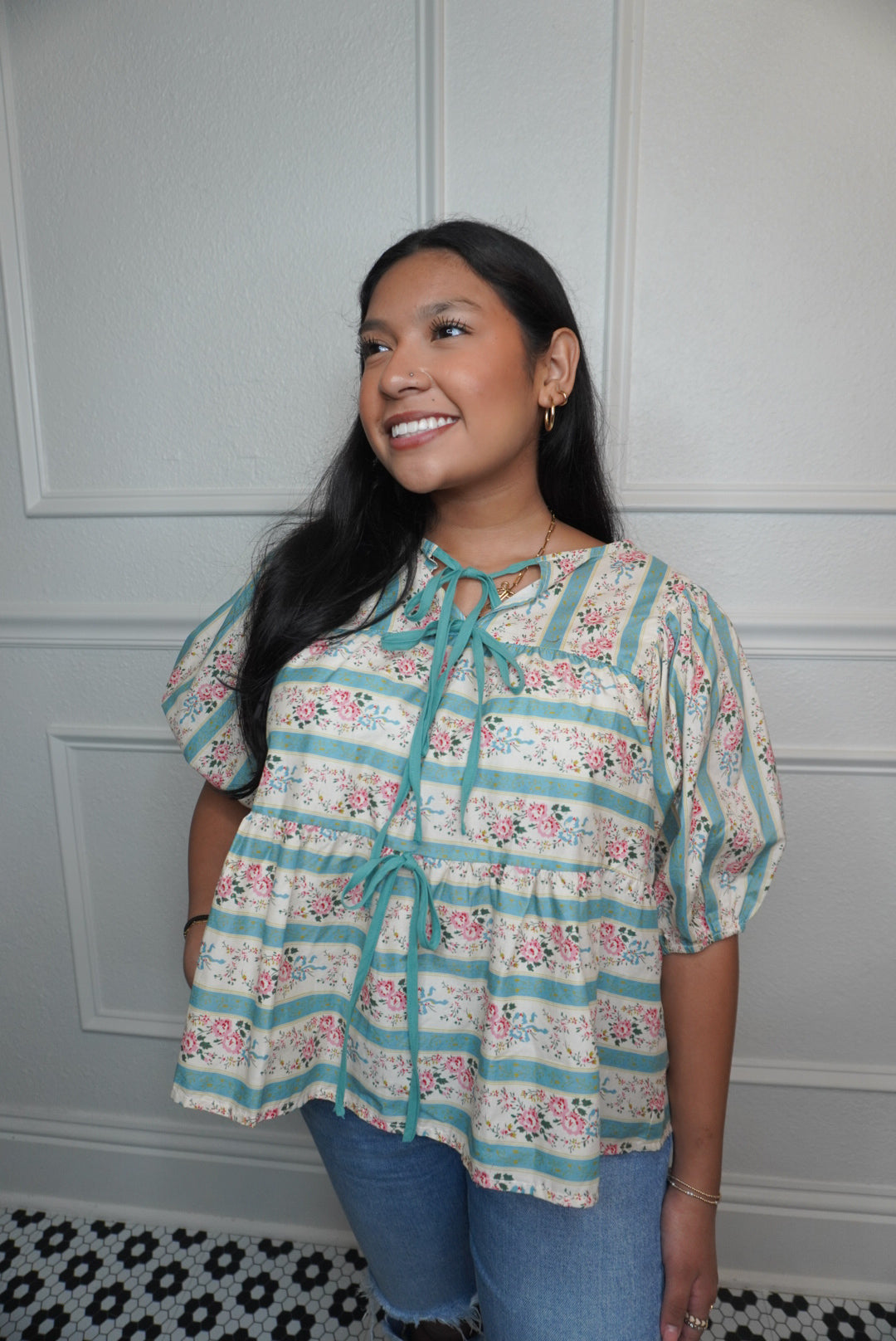 - Introducing the So Vintage Top, with its elegant combination of floral and striped woven fabric. The statement balloon sleeves add a touch of whimsy, while the front bow tie creates a sophisticated silhouette. Upgrade your wardrobe with this versatile top, perfect for any occasion.
