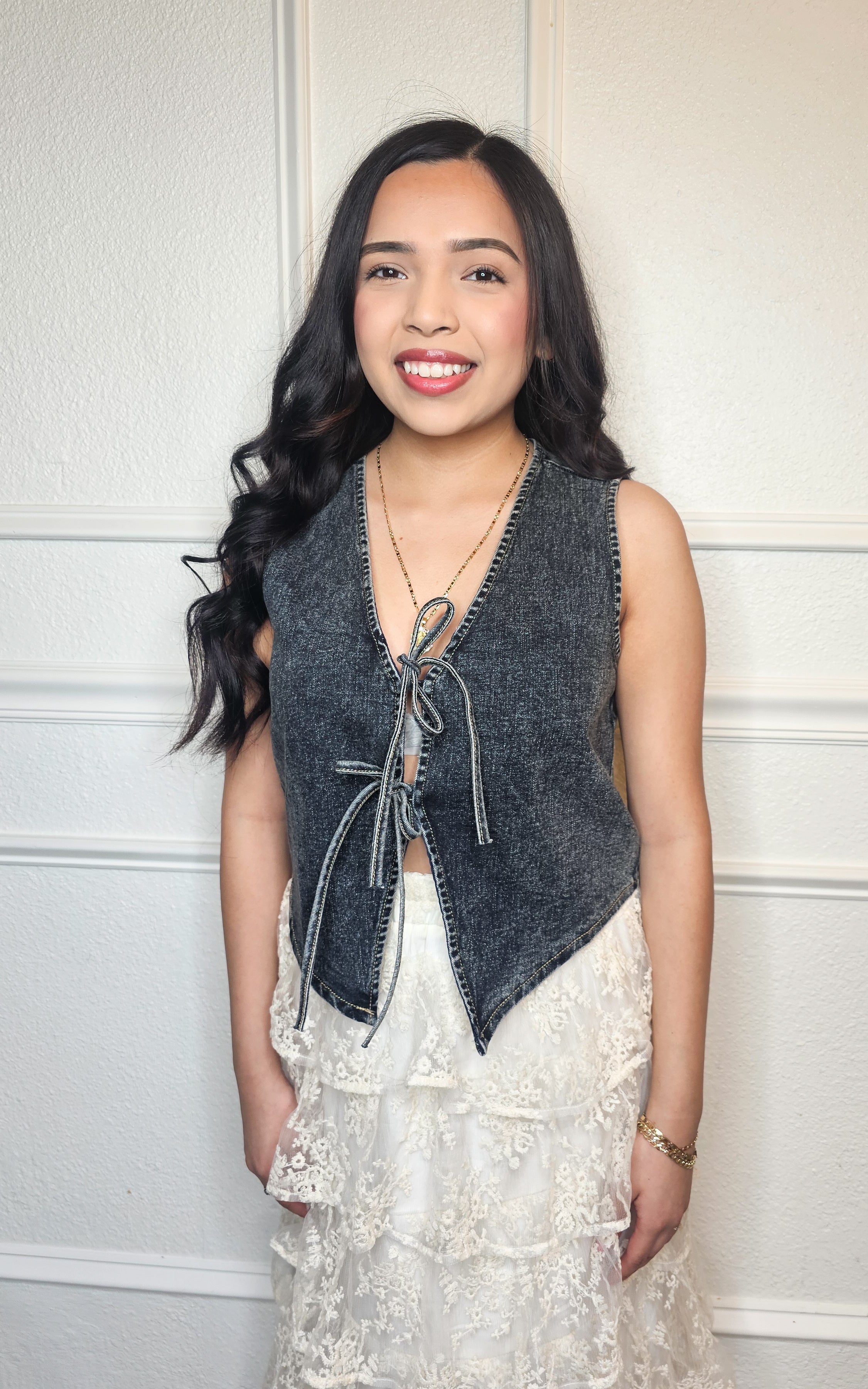 - Description: This denim vest provides a perfect combination of style and functionality. Its cropped design offers a trendy and edgy look, while the two front ties add a touch of uniqueness. Made from high-quality denim material, it is durable and comfortable. A must-have for any fashion-forward wardrobe.
