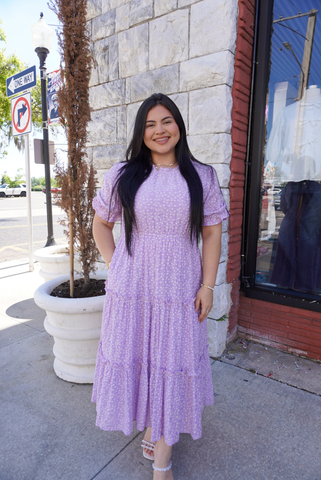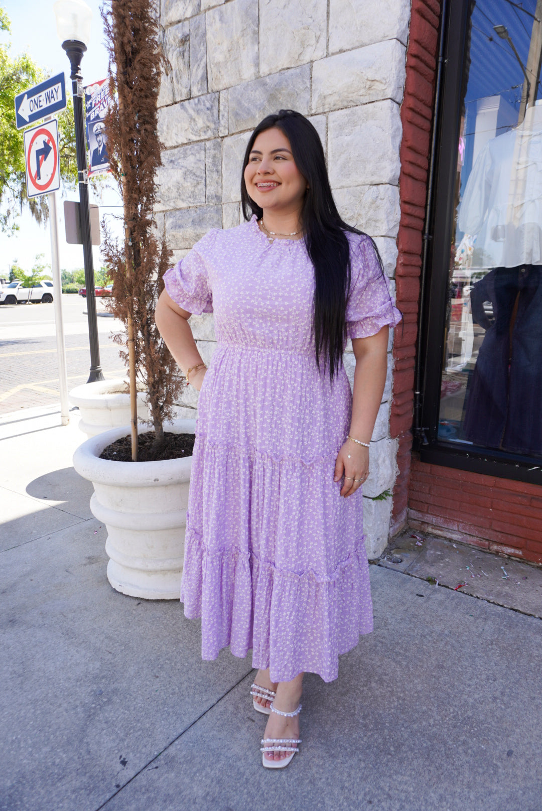 - Elevate your style with our Lavender Maxi Dress. Featuring a round neck and short sleeves, this dress is perfect for all occasions. With a stunning floral print, you'll make a statement wherever you go. Experience the versatility and beauty of our dress.